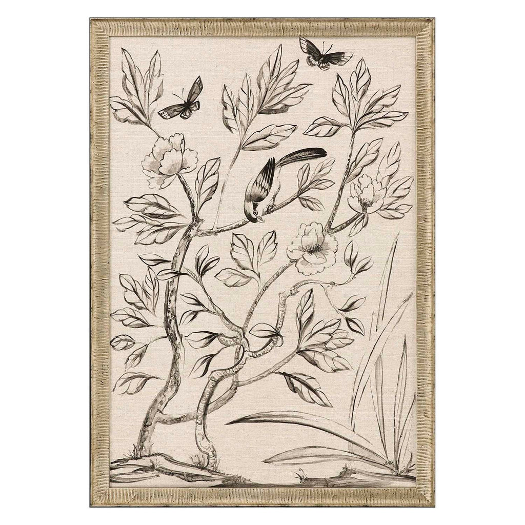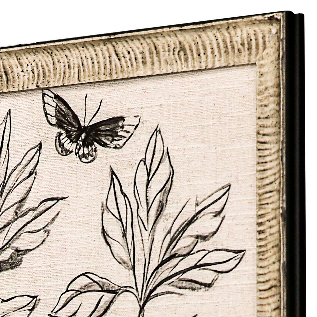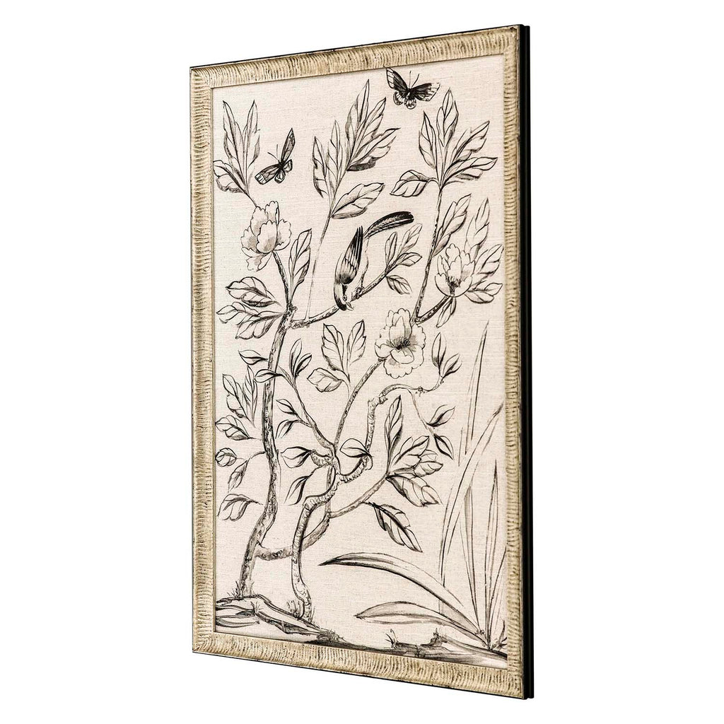 Vintage garden floral imagery is framed in an antique silver leaf sloped wood with embossed face and black painted side.