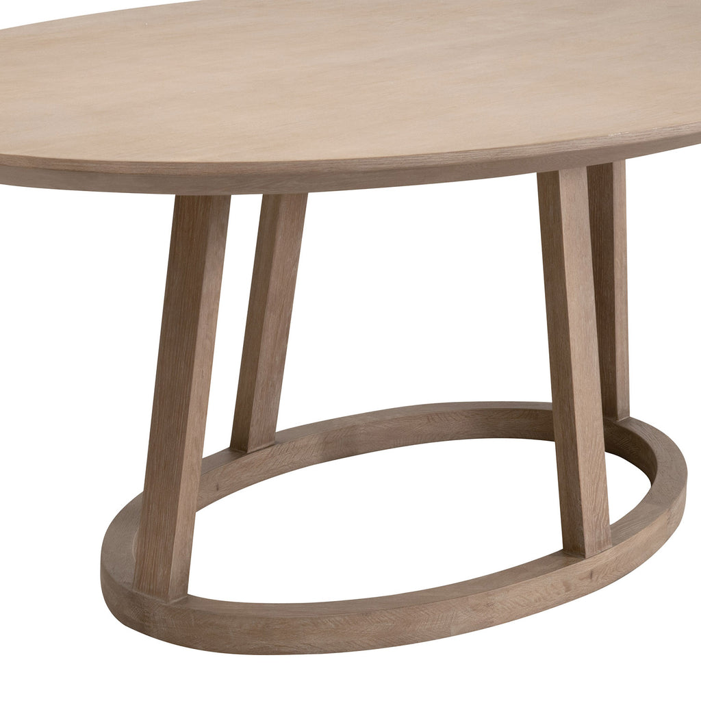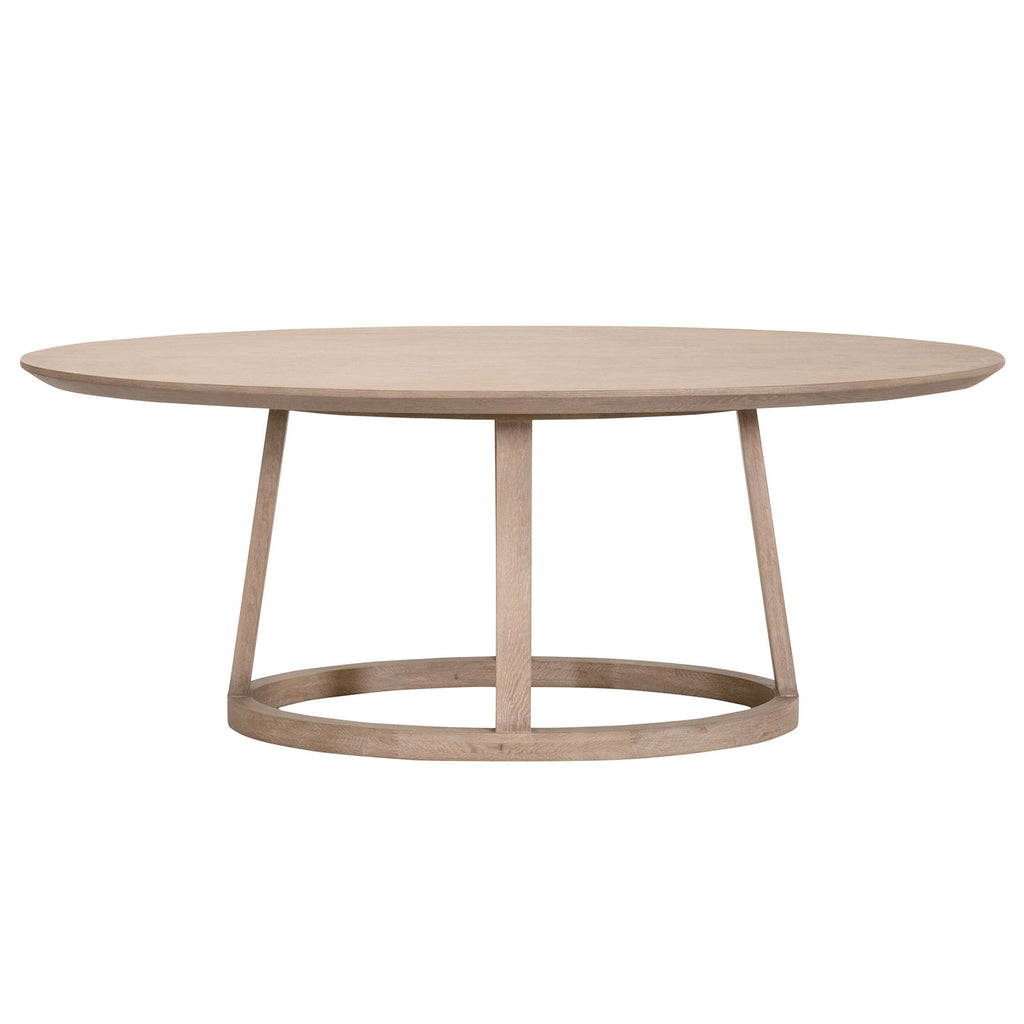 With its timeless silhouette and refined materials, this Reeves Oval Dining Table by Essentials For Living offers a versatile centerpiece for both casual meals and formal gatherings. It measures 78in wide, 48in deep, and 30.25in high. The plank veneer top showcases a beautiful smoke gray oak finish treated with a reinforced, stain-resistant coating for added durability and easy maintenance. A solid pine wood pedestal base provides sturdy support while creating an open, airy feel beneath the tabletop. Comfortably seating four, this transitional design blends warmth and practicality, making it a natural fit for a variety of dining spaces.