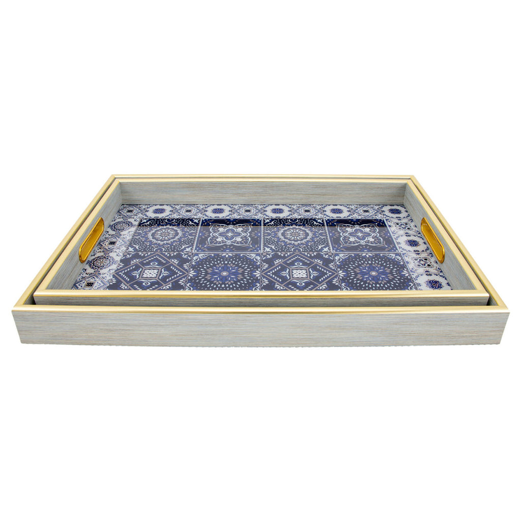 Exquisite Set of 2 Trays with Blue and Gold Frame and Greek Mosaic-Inspired Bottom. Elevate your hosting and decor with this breathtaking set of two trays. Featuring a striking blue and gold finish frame, these trays exude elegance and charm. The bottom is adorned with a captivating Greek mosaic-inspired design, adding a touch of classic artistry to their modern appeal. Perfect for serving drinks, snacks, or displaying decorative accents, these trays combine functionality with timeless style, making them an exceptional addition to any home or a thoughtful gift for any occasion.