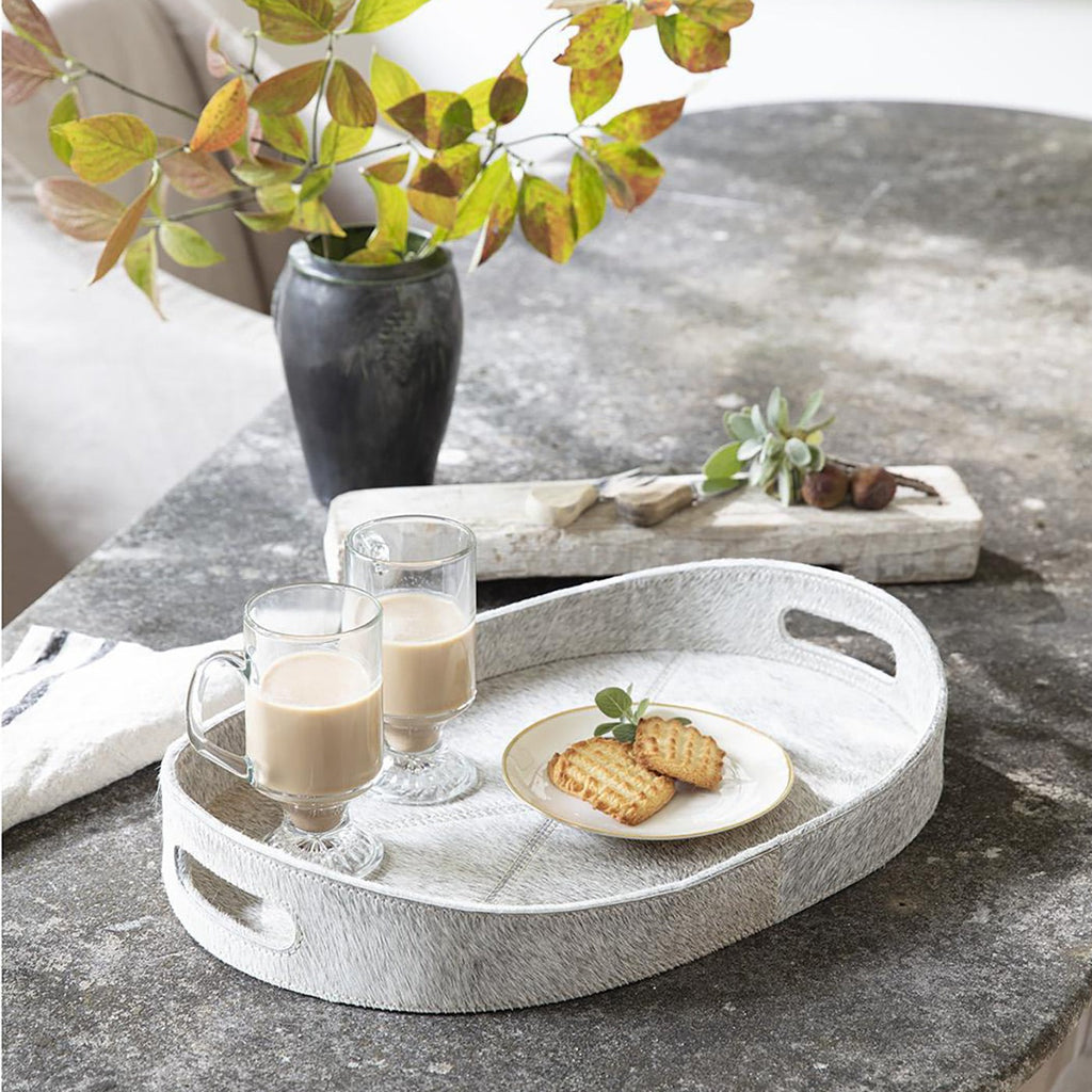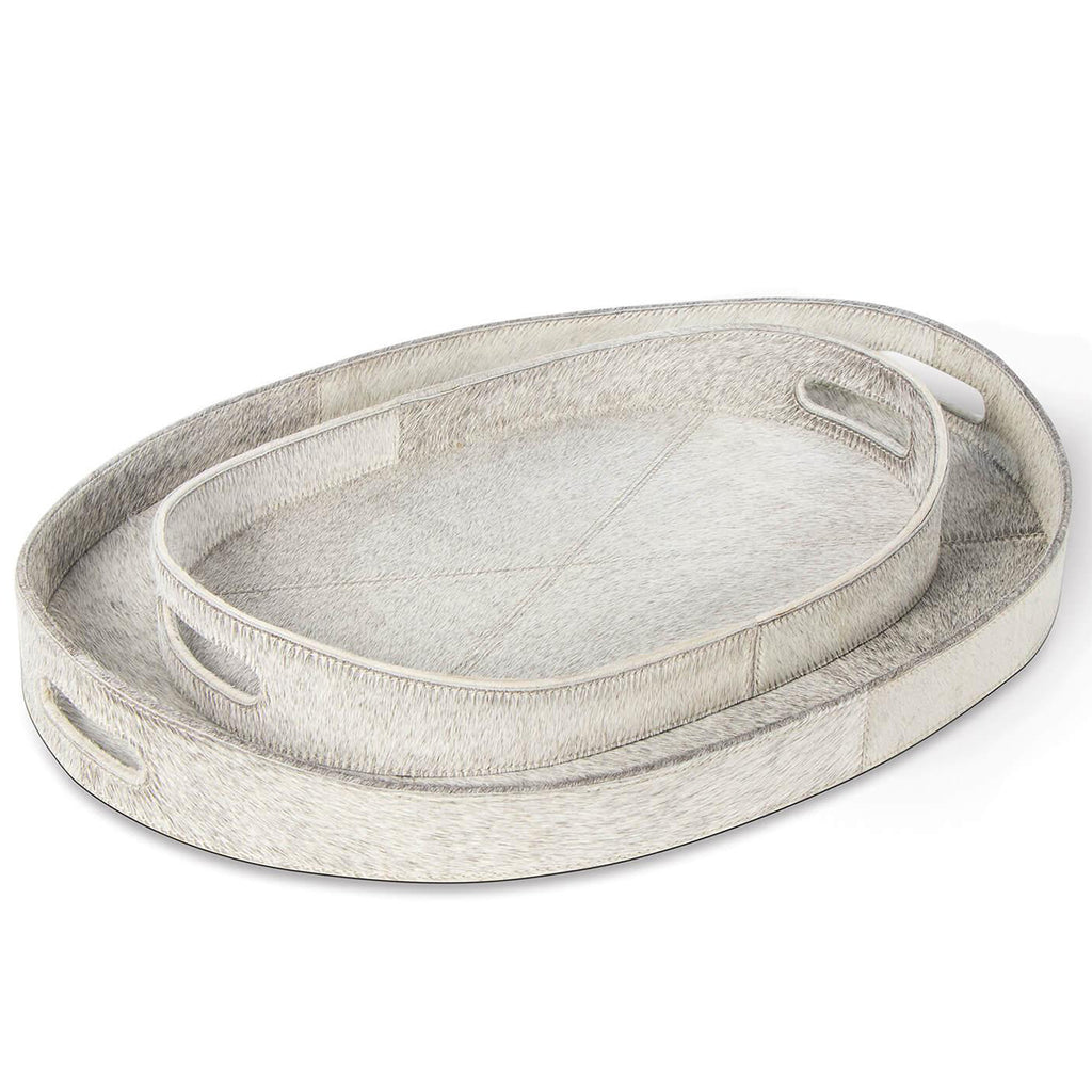 Inspired by the natural beauty and unique tones of gray hair on hide, these trays are perfect for displaying candles, drinks, books and more. Stackable, with handles for ease of serving or moving, these trays add a touch of luxury to a casual dinner party or for your everyday use.
