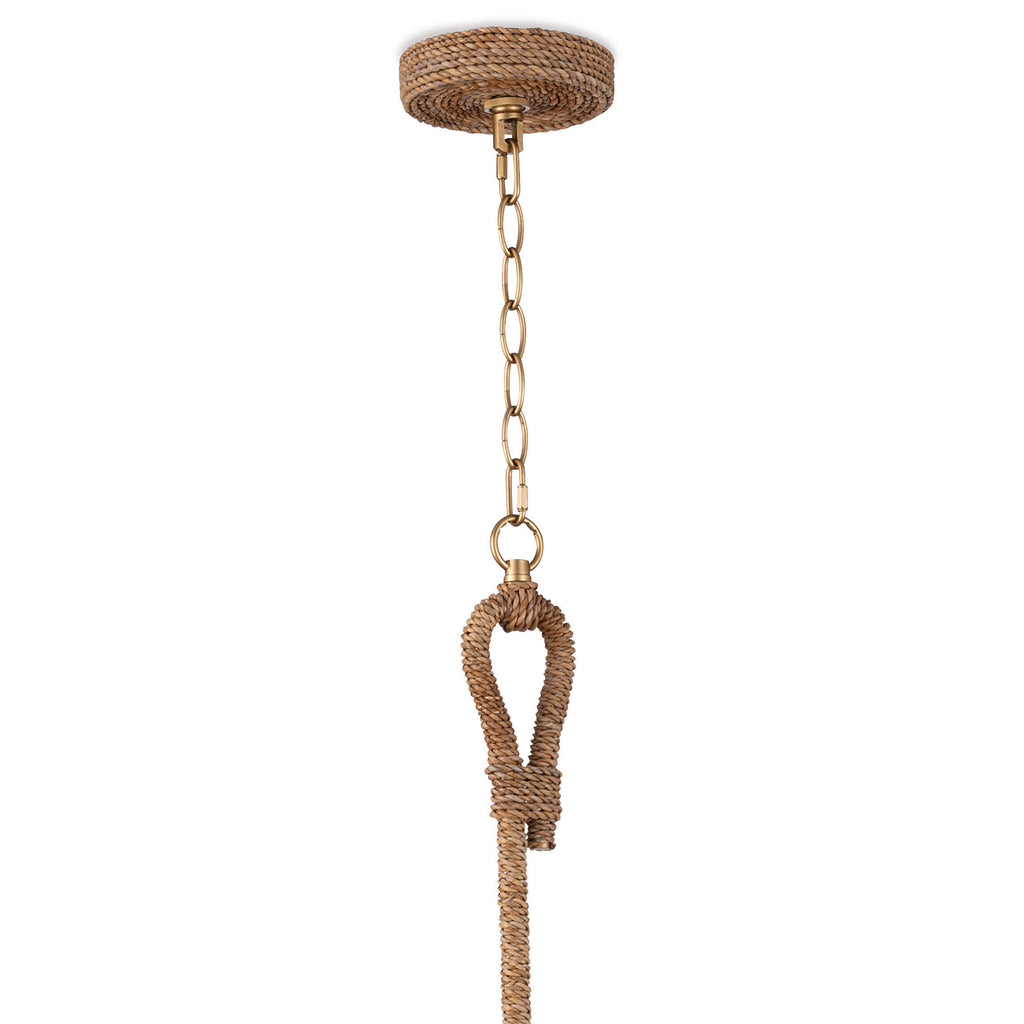 Natural woven rattan provides a "washed ashore" look on the Bimini chandelier. Looped detailing also provides a nautical touch, while six crisp natural linen shades tailor the look. Install above a dining room table in a coastal or rustic kitchen to tie its design together.