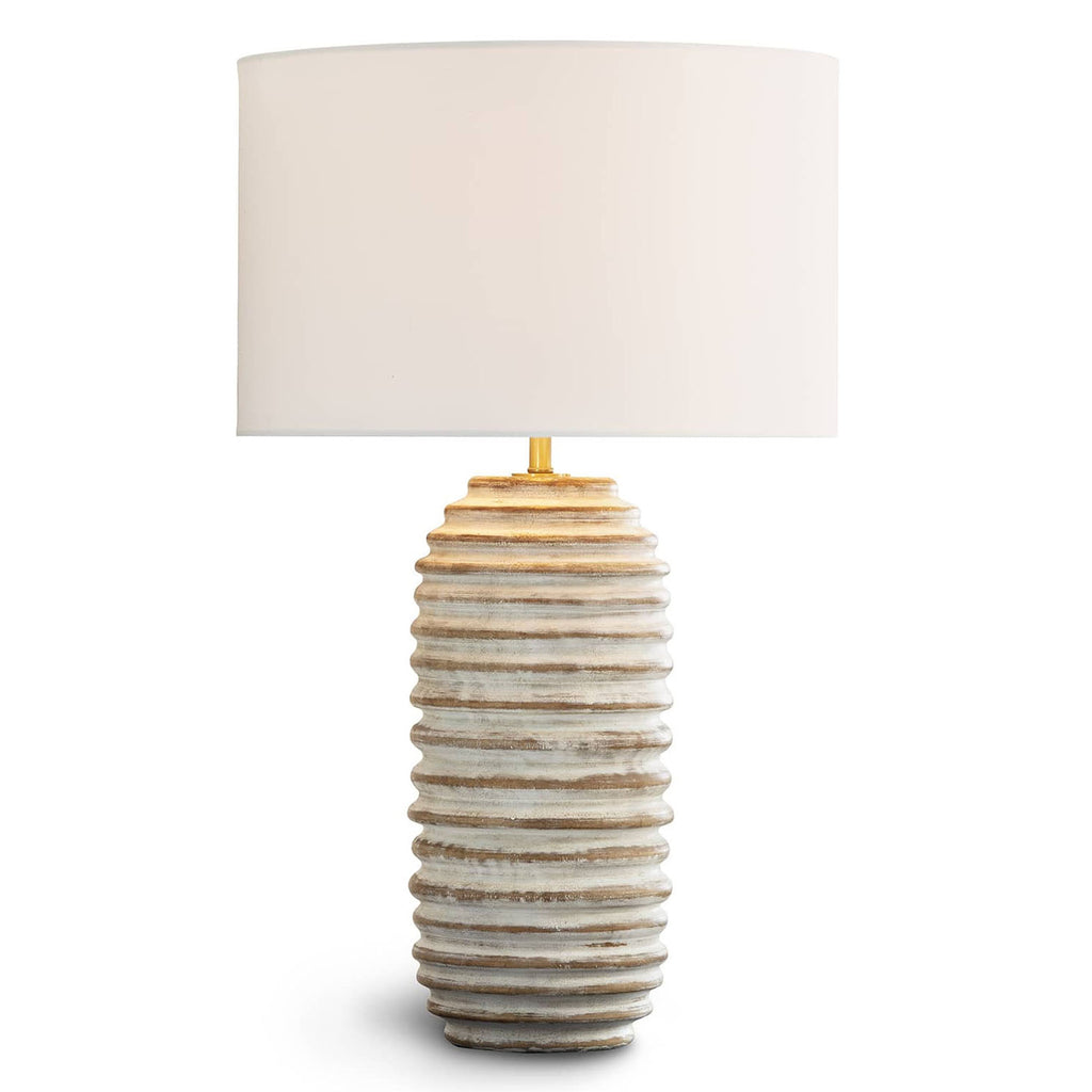 The Regina Andrew Carmel Table Lamp's wood body is white-washed and distressed like driftwood that has been aged by the sun and sea. Carved ridges run along the entire body of the lamp, which is topped with a large drum shade and natural brassl ball finial.Whether in a relaxed coastal retreat or a neutral bedroom getaway, the Carmel Lamp will provide both sculptural interest and beautiful, warm lighting to your space.
