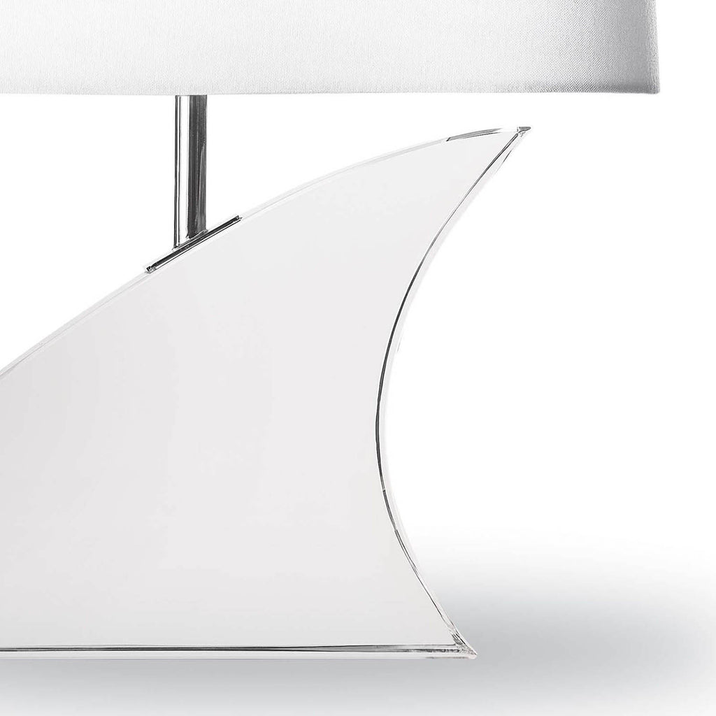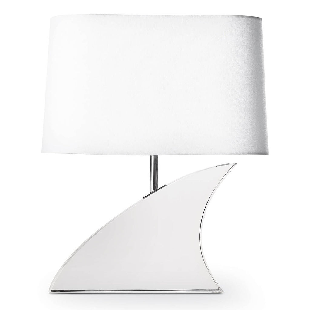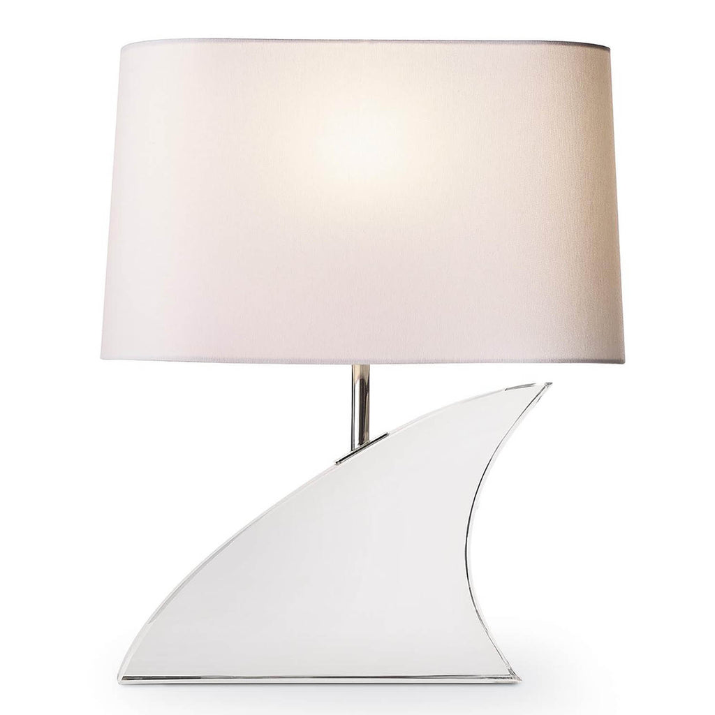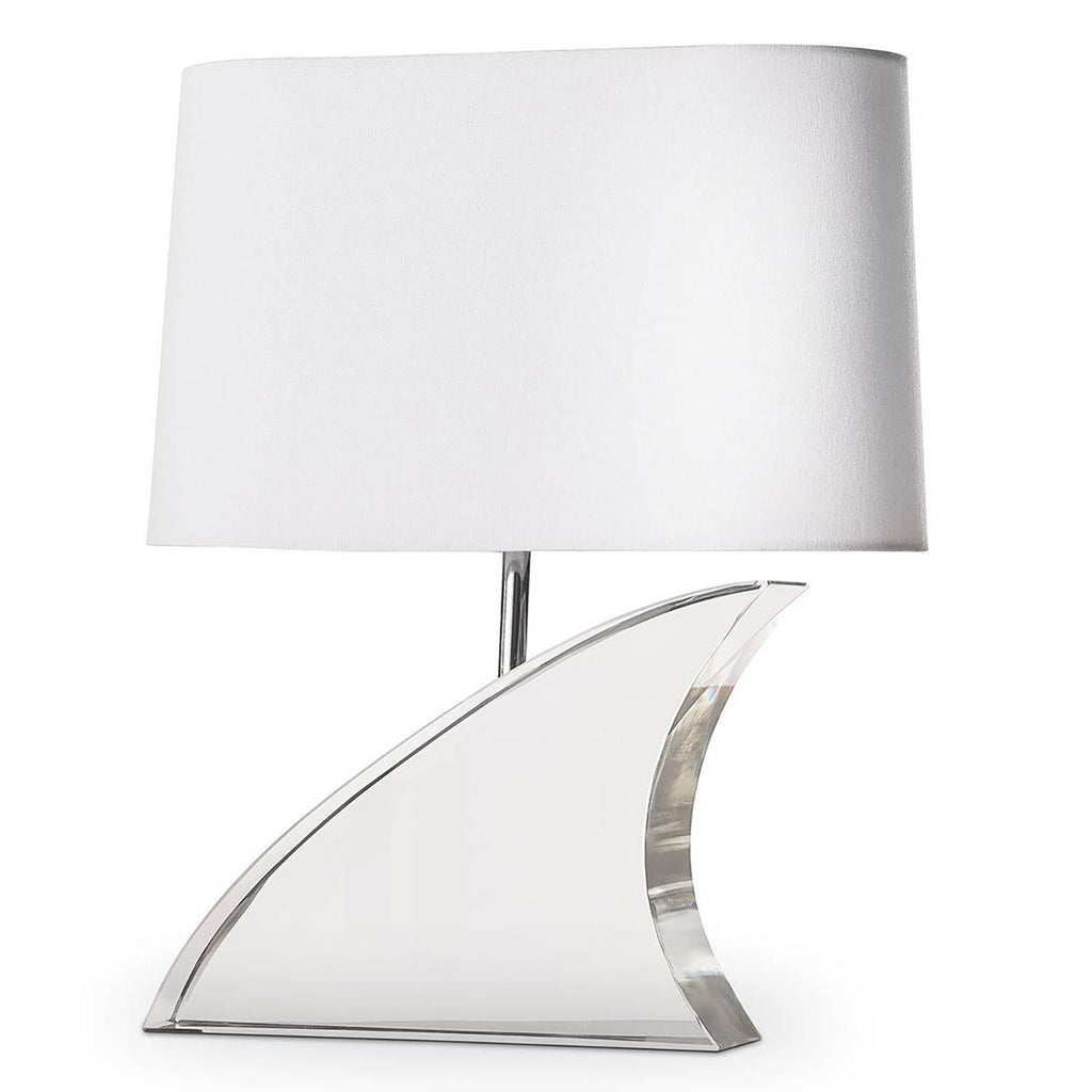 Inspired by a vintage art piece, the sharp Fin Crystal Table Lamp cuts a graphic figure with an elevated coastal-modern vibe. The rectangular natural linen shade floats above a clear sculptural fin that invites light to flow through your space. Evocative of a sparkling sea, cool polished nickel accents complete this eye-catching piece.