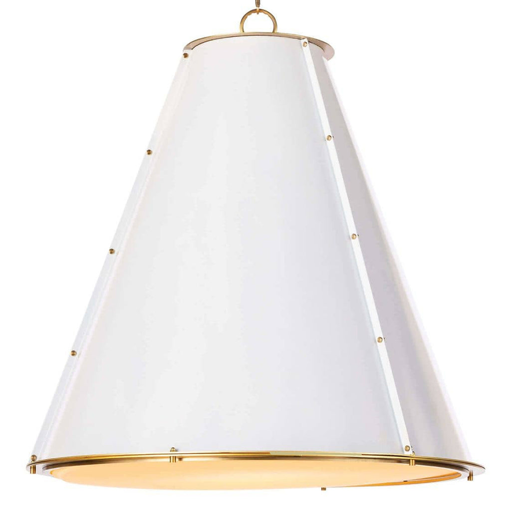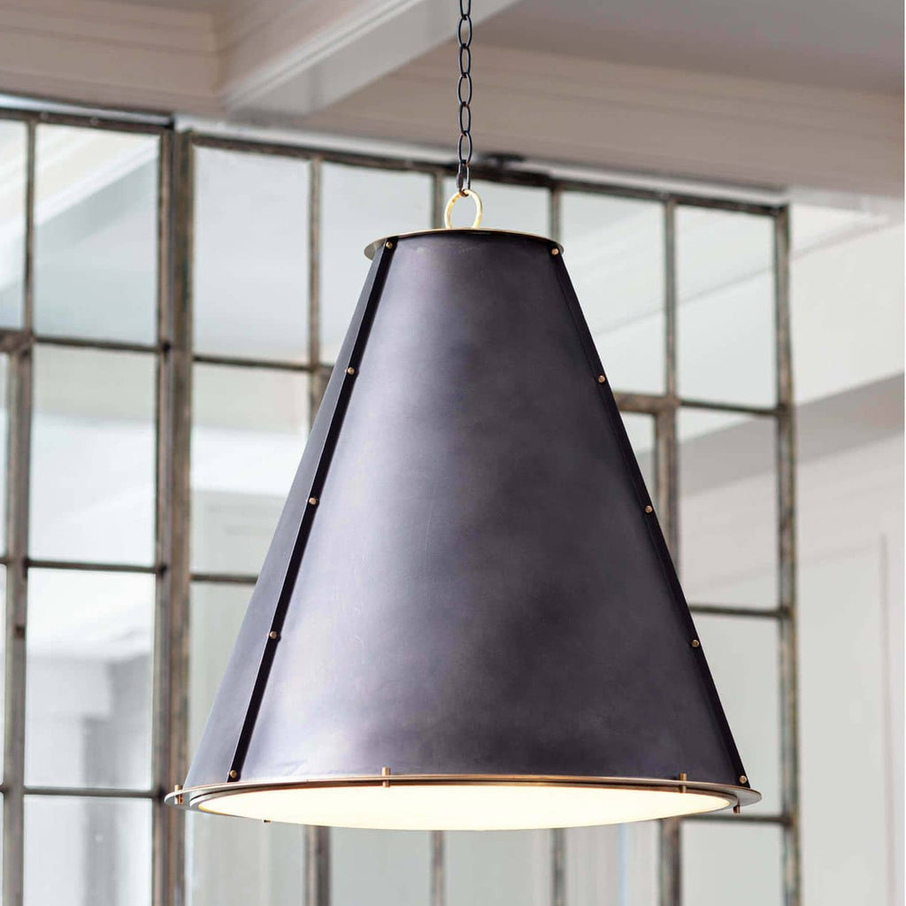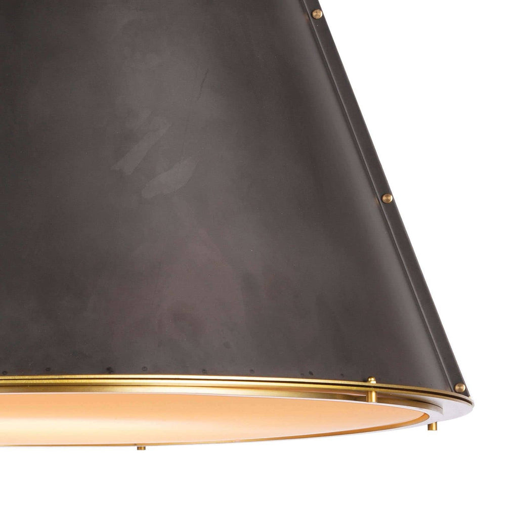 A cone silhouette is trimmed with a natural brass ring on the top and bottom of the French Maid chandelier. Brass studs provide an industrial detail and a diffuser shade provides nice ambient light for a kitchen island.