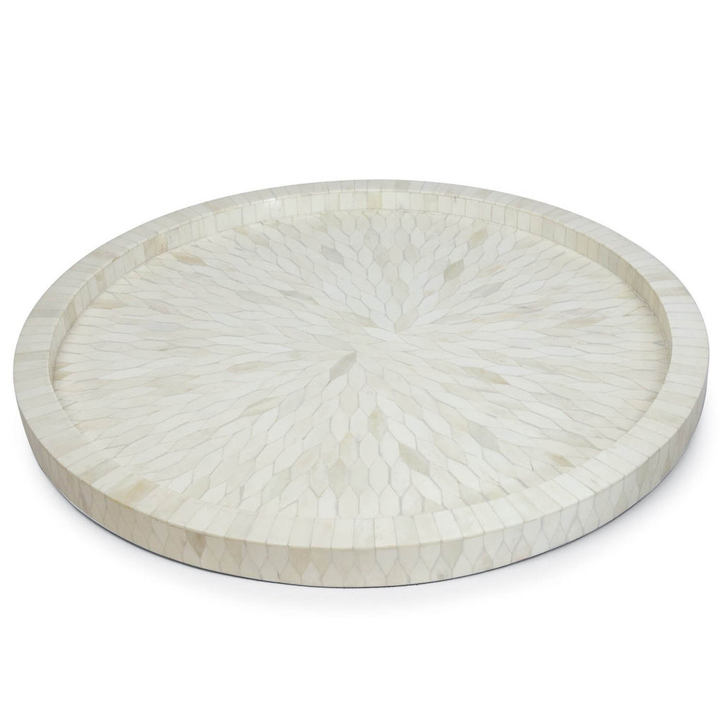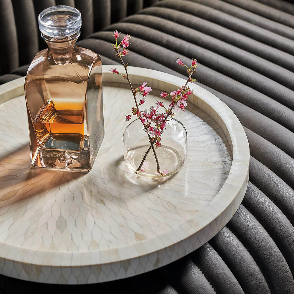 Handcrafted in India, the Jullian Round Bone Tray in creamy white catches the eye with a veneer of mosaic bone art in a delicate floral pattern. You’ll find so many reasons to use this unique decorative tray – and never put it away. Perfect for wine and cheese pairings at your next event, to display a collection of meaningful trinkets or a cluster of candles to set the mood.