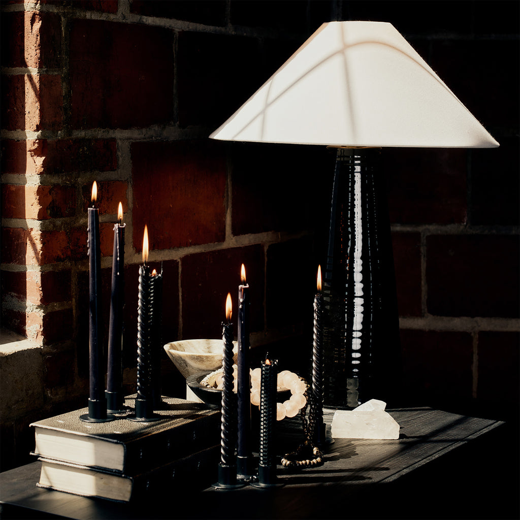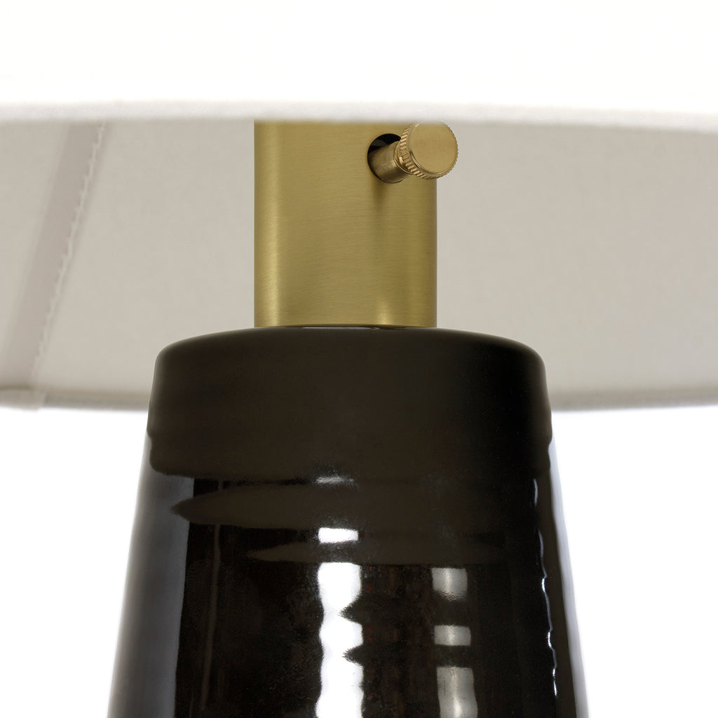 The Koda Ceramic Table Lamp is accented with horizontal throwing lines that add handcrafted texture and depth. Topped with a distinctive triangular coolie shade, this lamp introduces a fresh play on proportion.