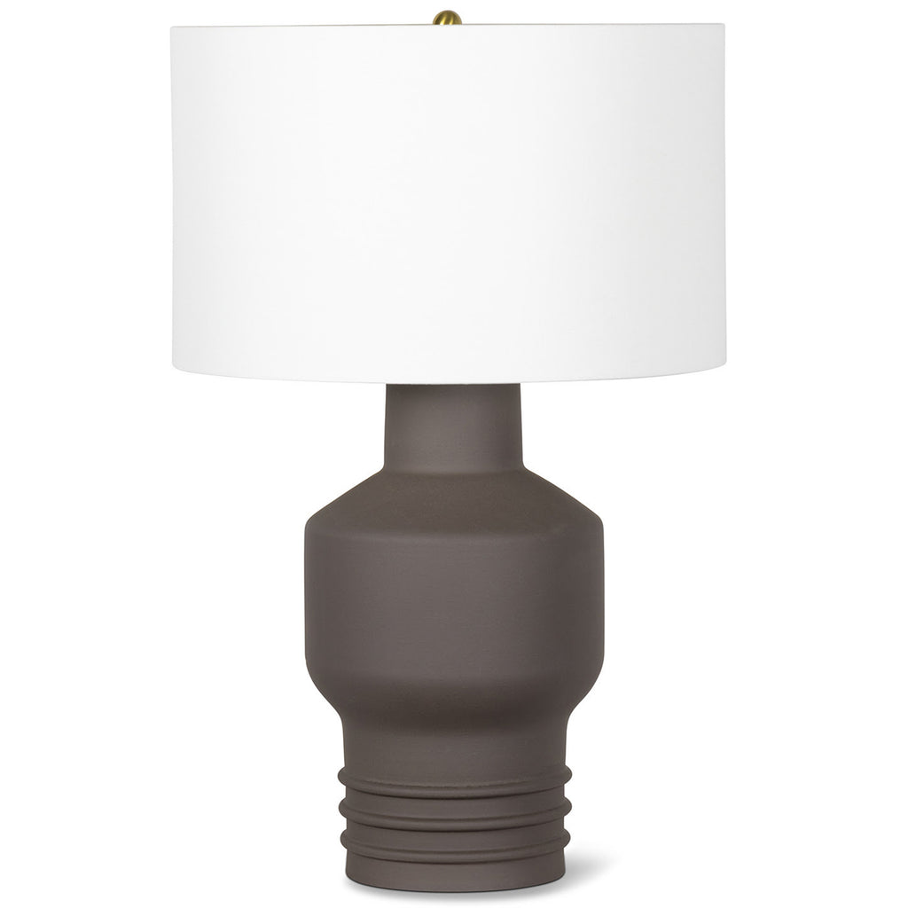 The matte dark brown-black finish and shape of the Lewis Ceramic Table Lamp underscores its commanding presence. The sculptural base combines the look of modern pottery with a solid color for a true statement piece.