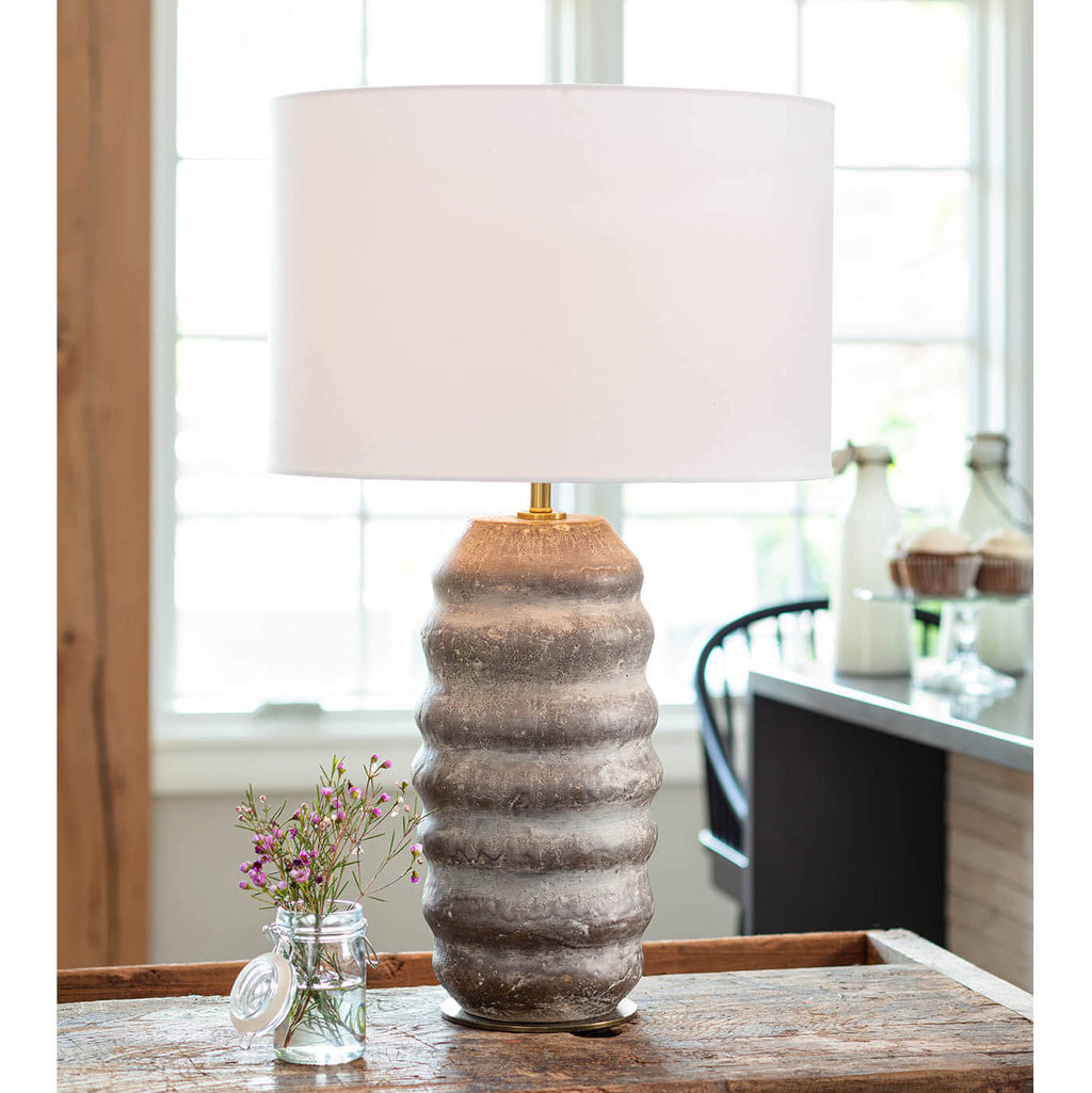 The Regina Andrew Ola has been expertly crafted by artisan hands to achieve the natural, organic look of true earthenware. Finished with a hand-applied, matte glaze that produces various shades of earthen brown and tan. The coloring and distressing is further enhanced by the natural, repeating curves that make up the lamp's body. Finished with an aged brass metal disc at the base and drum shade in natural linen at the top, the Ola is the perfect lamp to add to a space that welcomes the imperfect beauty of nature.