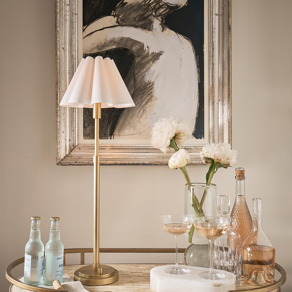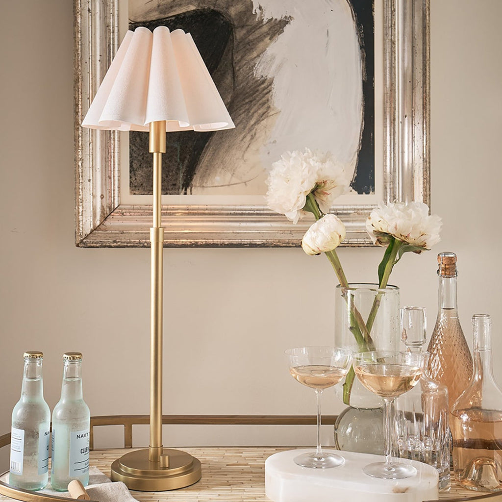 The Polly Buffet Table Lamp showcases sophistication with its single scalloped shade, casting a warm and inviting glow that adds an elegant touch to your dining or side table with its rich, verdant hue. The lamp’s gracefully designed base combines classic charm with a modern touch, offering a beautifully versatile piece that enhances any room with its refined and stylish accent.