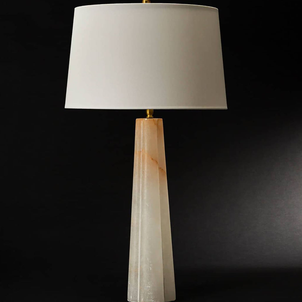 Unusually lightly colored, translucent, and soft stones, alabaster has been used throughout history primarily for carving decorative artifacts. A tapered alabaster base juxtaposed by a more traditional drum shade, makes this lamp a beautifully well-balanced source of light and style.