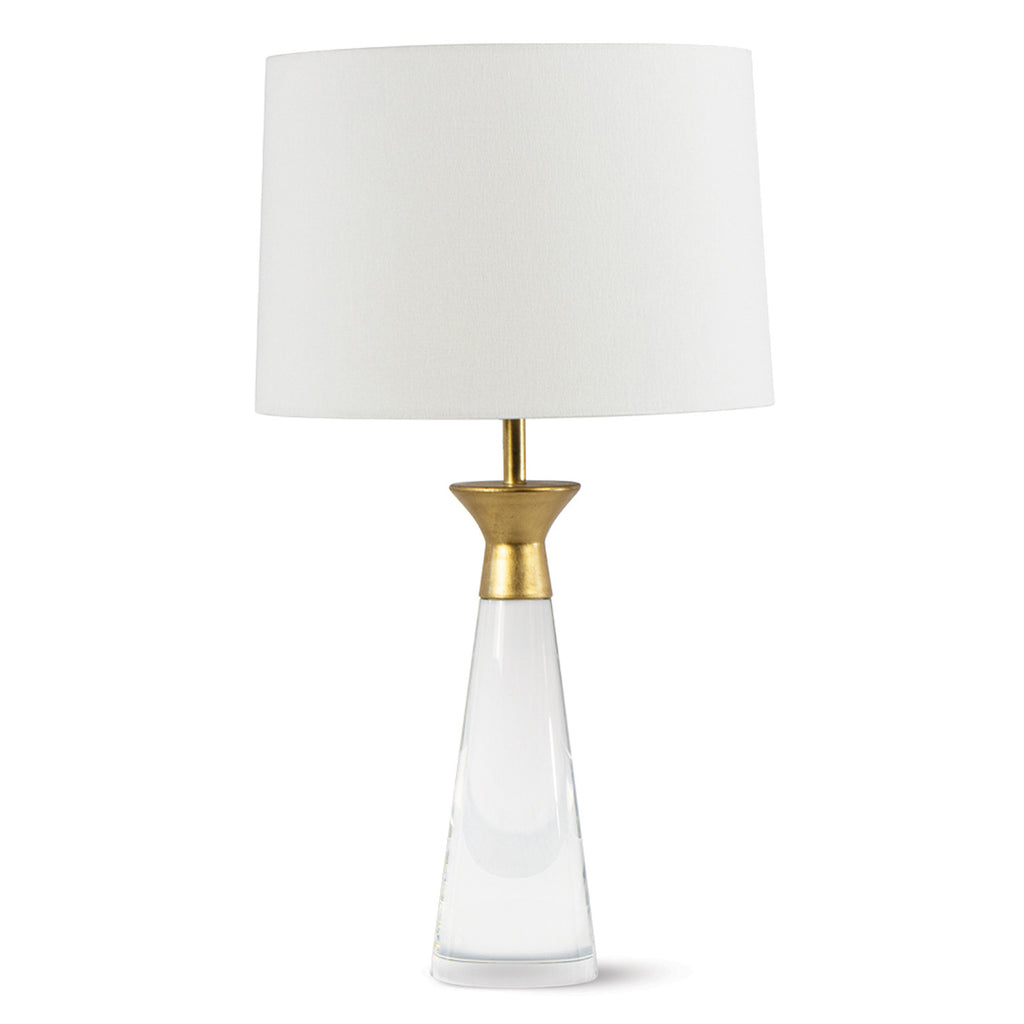 Simplicity is the Starling's strong-suit. A classic conical crystal base is uniquely capped in a gold leafed metal. The simple silhouette is crowned with a subtly tapered, natural linen shade and matching gold ball finial. Place this traditional crystal lamp with a modern twist in a living room, bedroom, den or entryway.