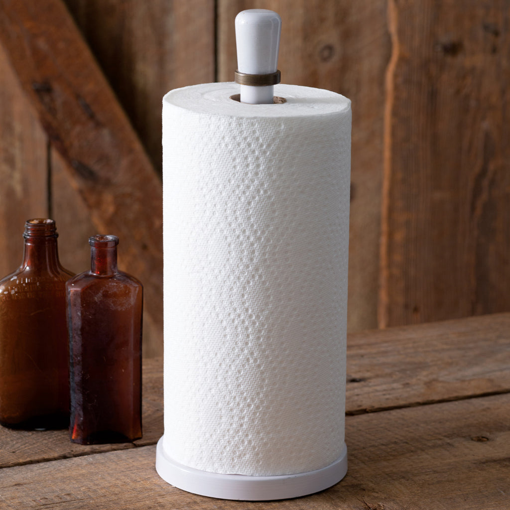 With its retro look, this paper towel holder will be a pleasant touch to your kitchen. It is made of metal and features antique brass accents.