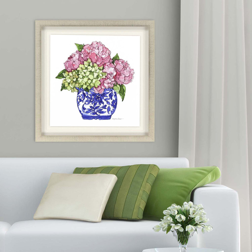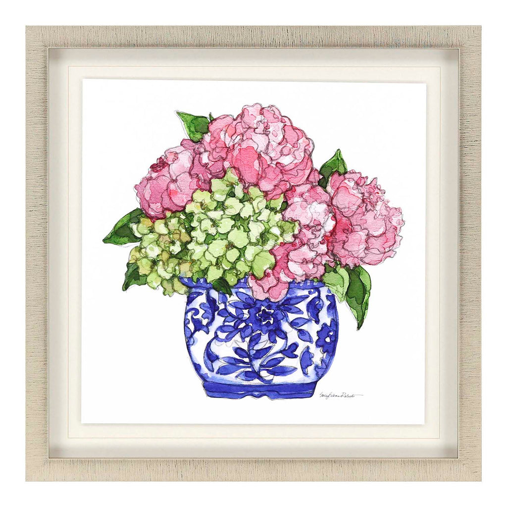 A timeless floral is float mounted and matted in taupe. Framed in a champagne gold block contemporary molding.