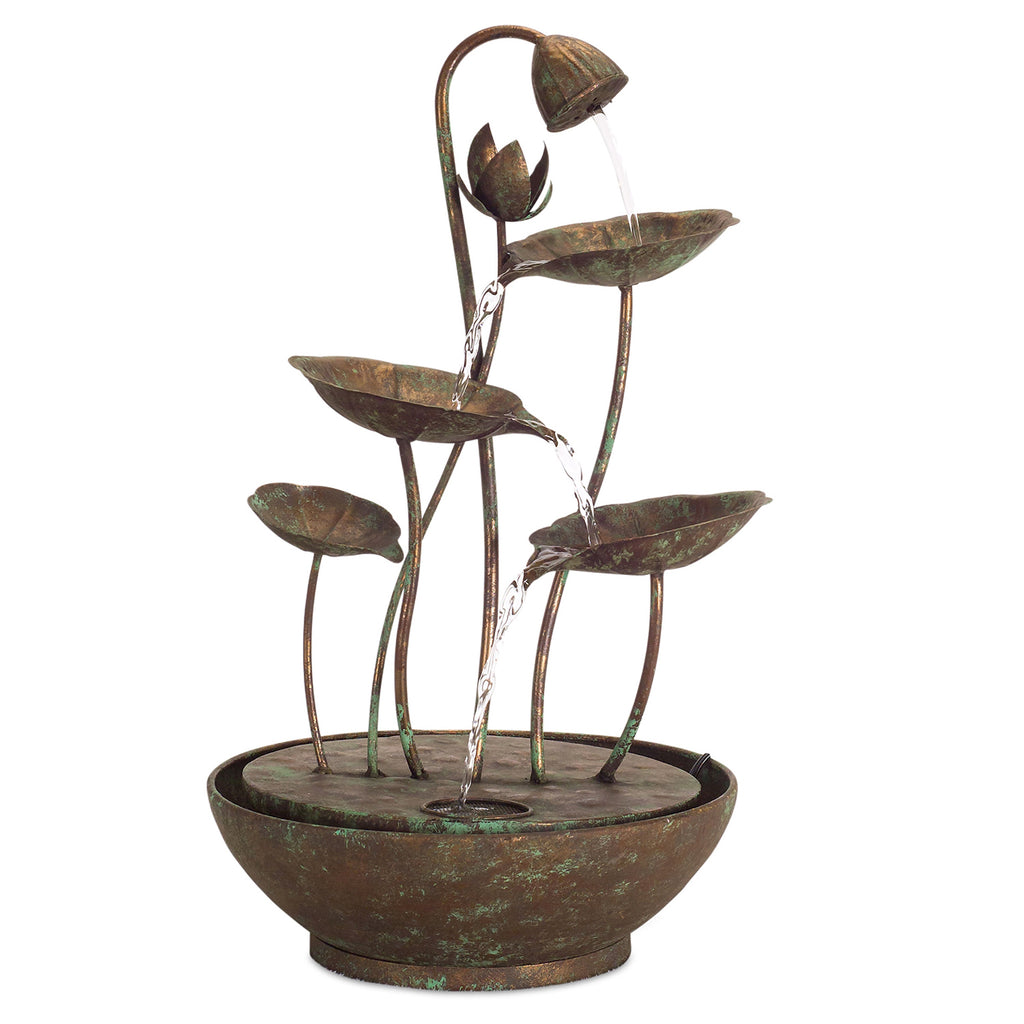 Decorate your home or garden with the beautiful Lotus Leaf Fountain this spring season. Great for both indoor and outdoor use, its sturdy metal construction is guaranteed to last through the years. Water drips from the tallest lotus flower onto the descending lily pads and pools in the pot at the base. The soothing sound of water will create a relaxing ambiance in your garden retreat.