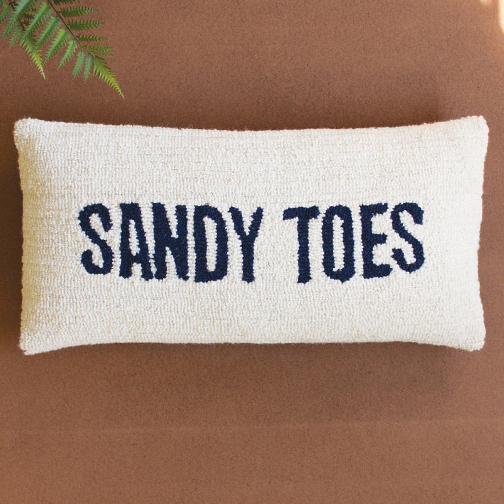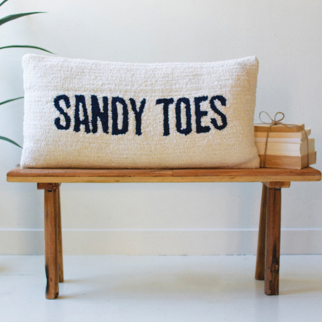 This sandy toes hand hooked pillow belongs at the beach. It was made in India. Gift one to your favorite beach bum.