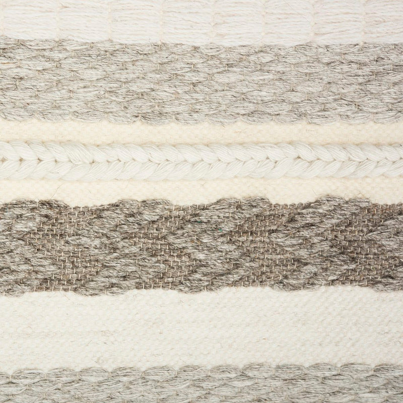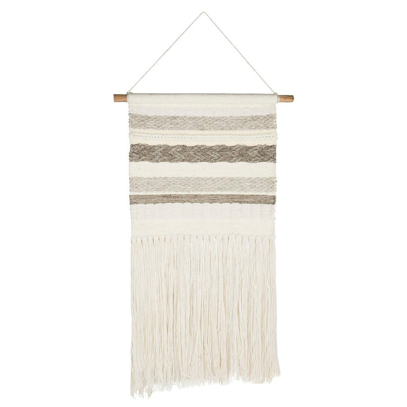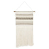 Created for minimalists who love luxurious style, this woven wall art adds a soft, welcoming touch to the living room. Its fine wool and cotton construction highlight the rich texture of its neutral Ivory and Grey lines and oversized fringe.