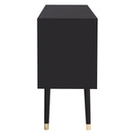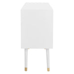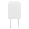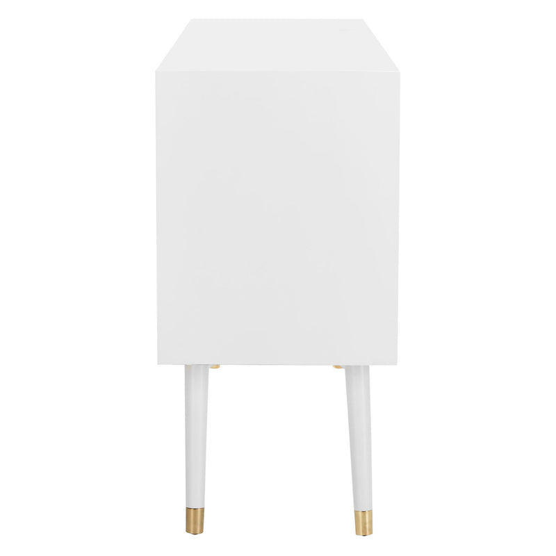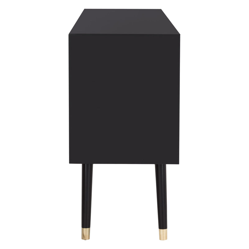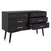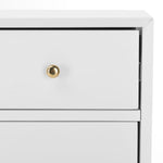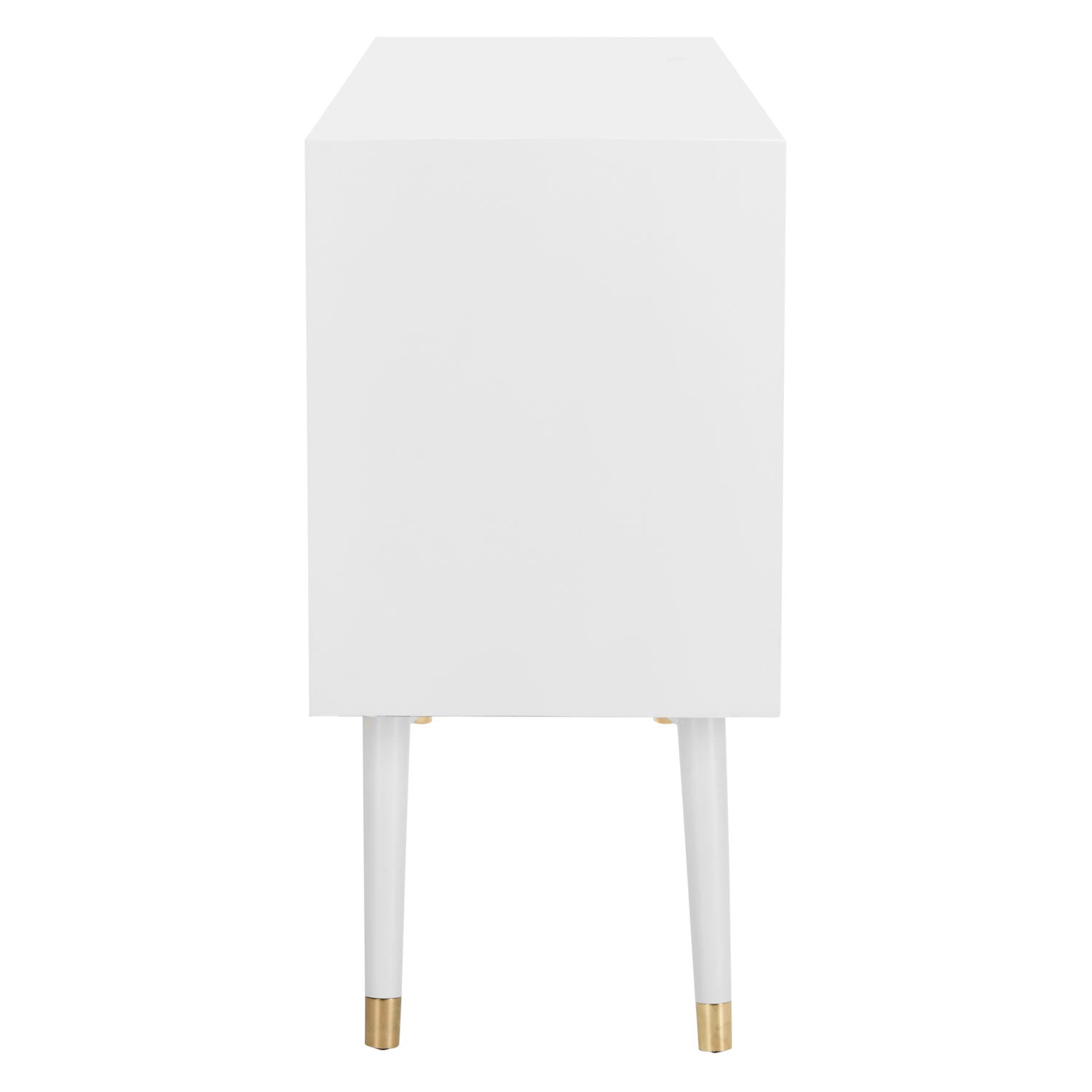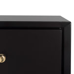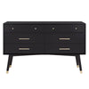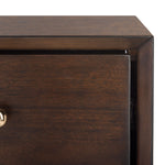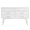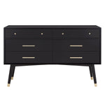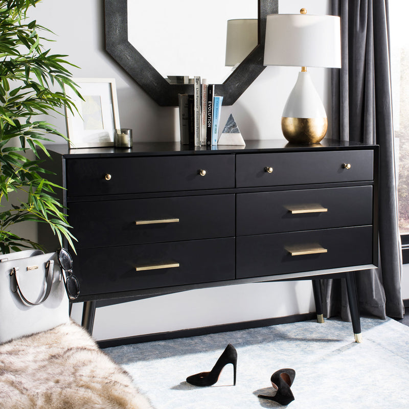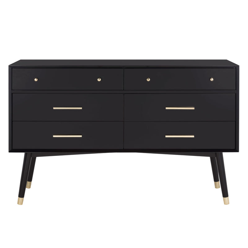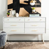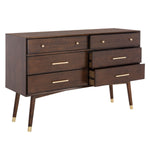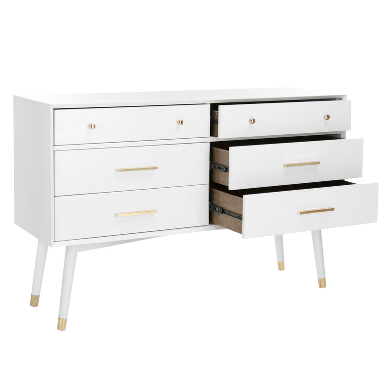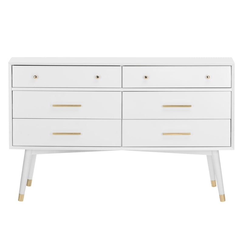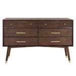 The mod style and character of this retro dresser updates any bedroom. Crafted with a wood veneer, its contemporary, sleek surface highlights the charming vintage-style brass hardware on its six drawers and chic capped legs.