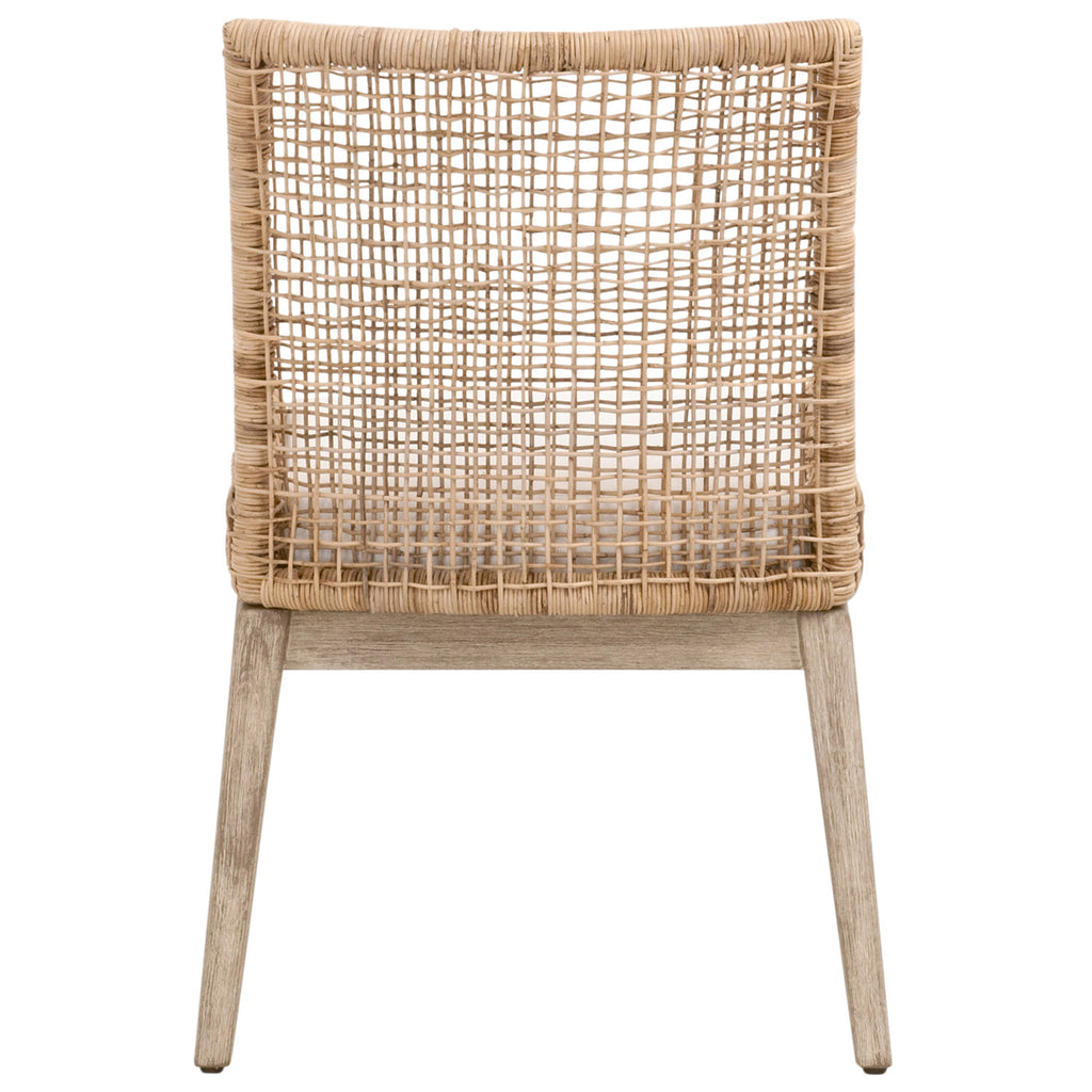 The Seaside Dining Chair by Essentials For Living brings a relaxed, coastal vibe with its natural rattan and natural gray mahogany frame. Measuring 24" wide, 25.5" deep, and 34.25" high, with a seat height of 20", it combines spacious comfort with tropical and beachy style. The handwoven rattan design adds artisanal charm, while the LiveSmart Peyton-Pearl fixed seat cushion, made from a durable polyester-nylon blend, ensures easy cleaning. The chair is supported by a solid wood base with KD construction for added strength. The warm tone and organic earthiness of the frame paired with the performance fabric of the seat make this chair a practical and visually appealing addition to any dining space.
