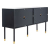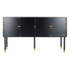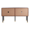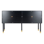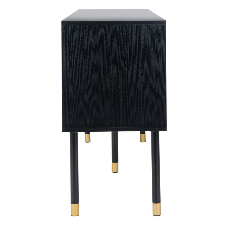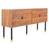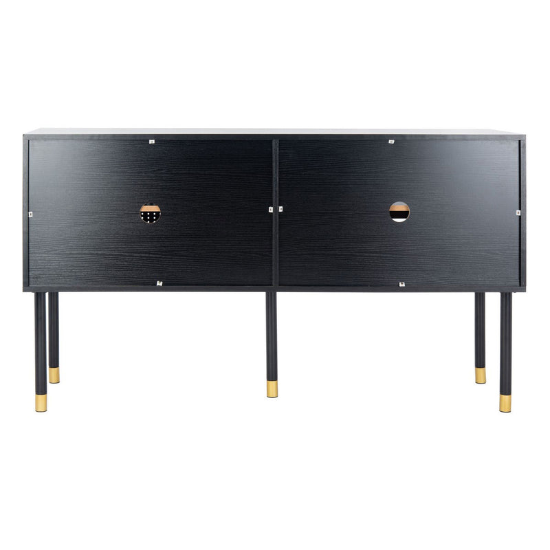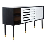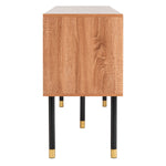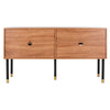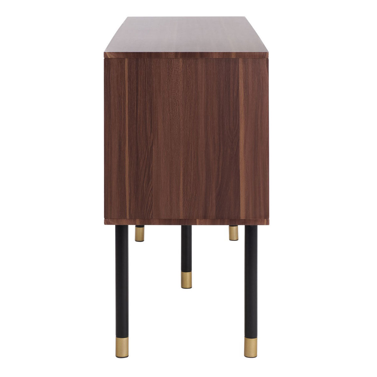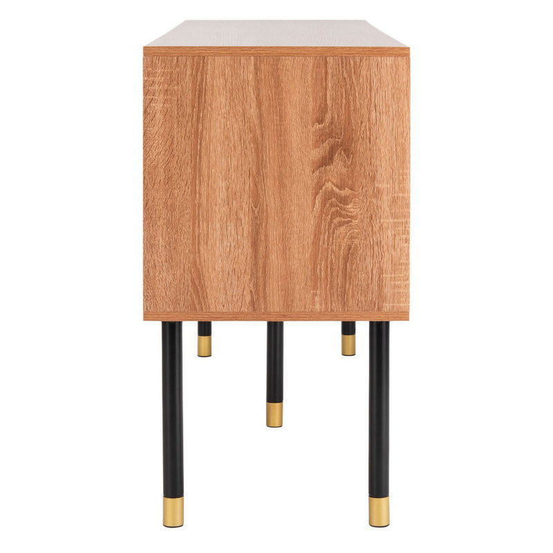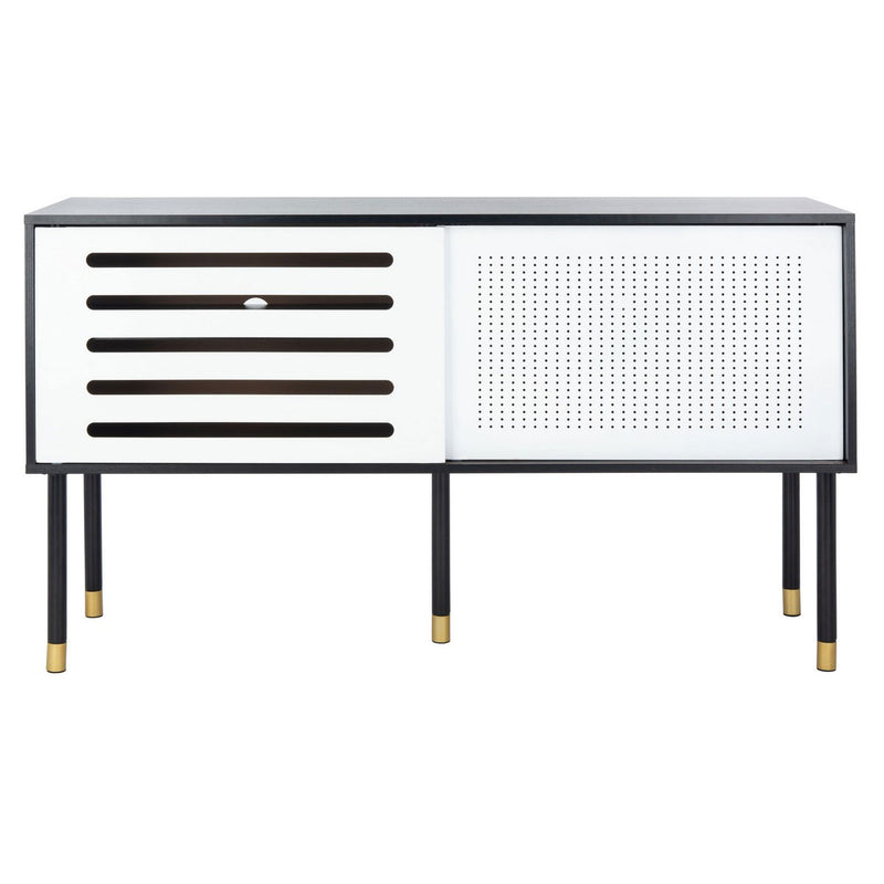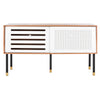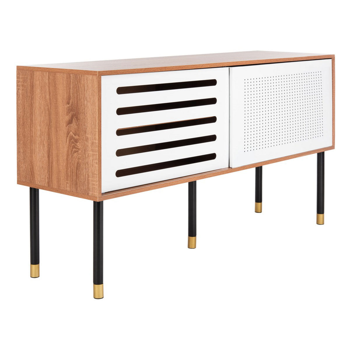Bring the character and warmth of retro style to any living room with this mod TV stand. Finely crafted with luxurious details, the beauty of its natural and white wood design and vintage-inspired black metal gold capped legs make it a designer must-have.