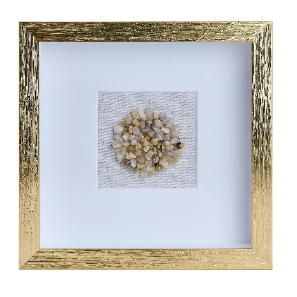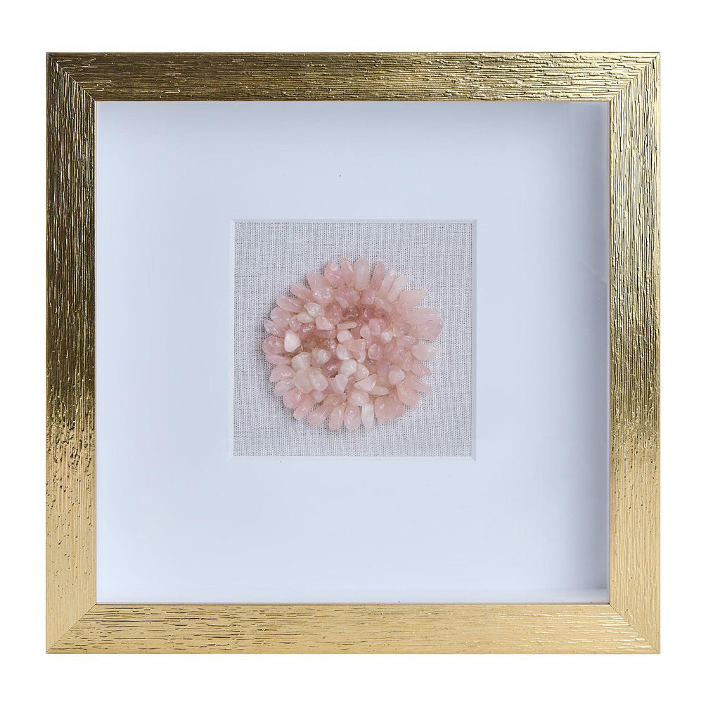 Transform your living space into a serene oasis. This exquisite set features a mesmerizing circle of semi-precious stones including Pink Quartz, Golden Quartz, Amethyst, and Aqua Quartz. Surrounded by a high-quality Golden MDF shadow box frame, each semi-precious stone is artfully placed to create a well balanced 3d wall art. This artwork exudes luxury and sophistication, making it the perfect addition to any elegant setting.