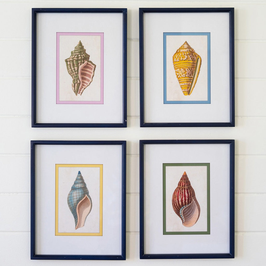 Add some color to your sandcastle. This set of four framed shell prints under glass features colorful shells framed by a contrasting matte in black frames. Arrange this set in a square or a vertical or horizontal line.