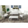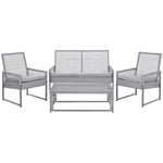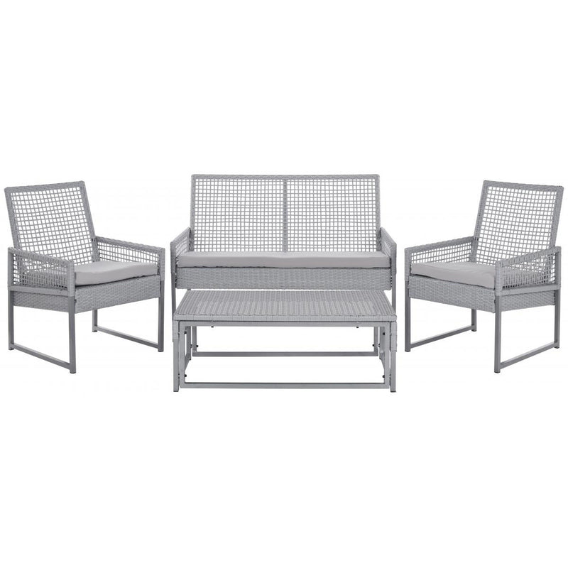Beautify your outdoor patios and decks for seasons to come with the contemporary Sidings 4-piece outdoor set. With clean transitional lines crafted of rattan aluminum for long wear and stability, and comfy cushions covered in matching grey easy-to-clean Terylene fabric that resists stains, mildew and weather. Chic rattan open mesh chair detailing coordinates with wicker weave for textural interest. Sold as set of 4.