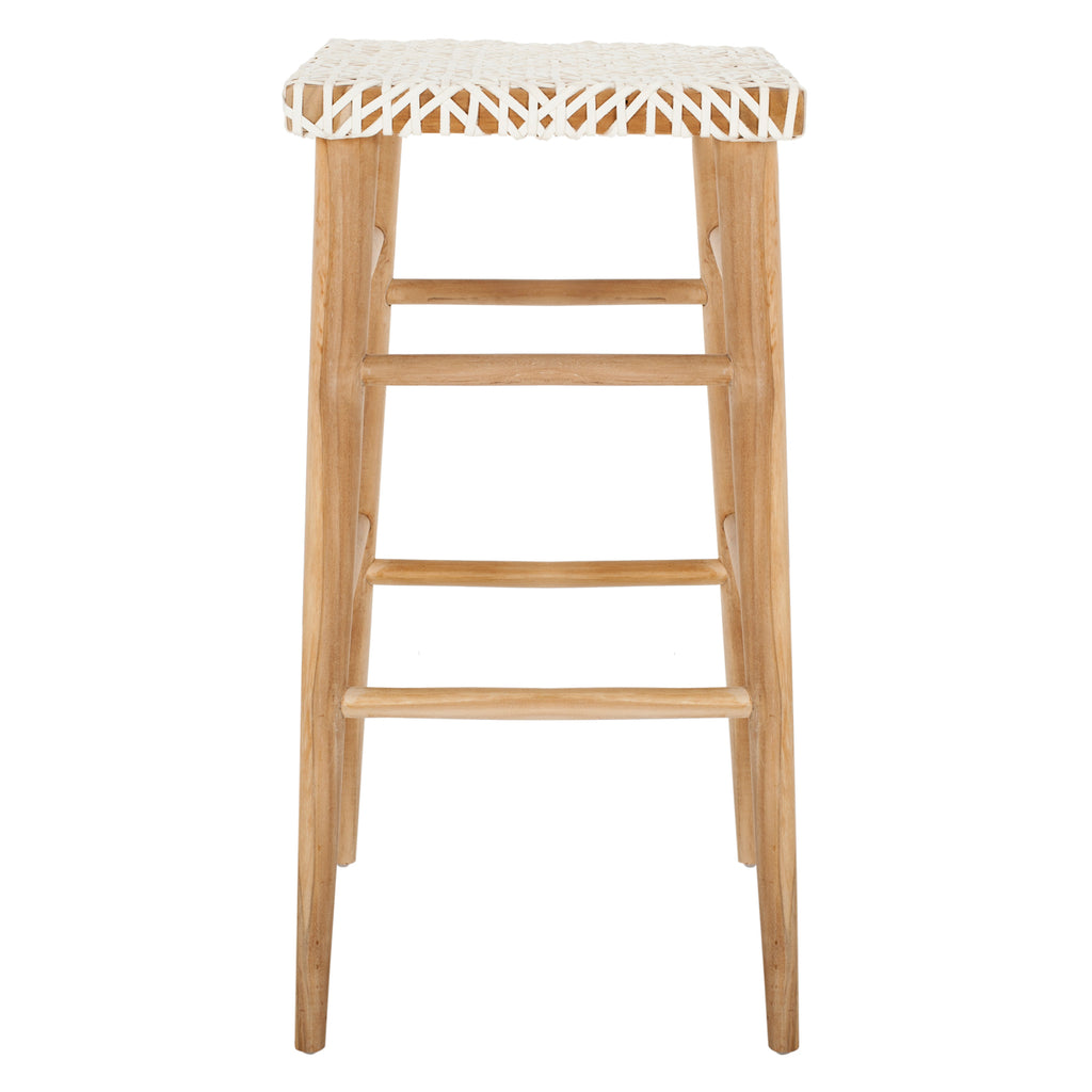Take your dining area to new heights with this contemporary woven leather barstool. Designed to highlight the natural beauty of its fine wood construction and stunning bold weave, its modern white cowhide leather blends seamlessly into any décor.