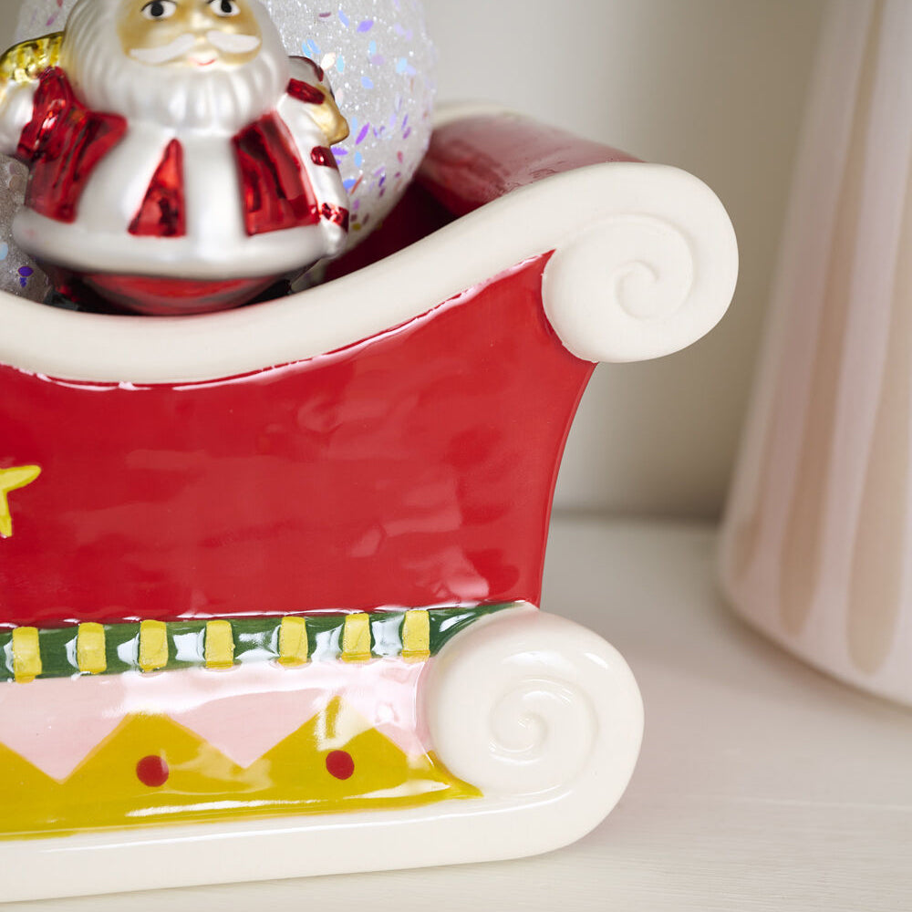 Celebrate the season in cheerful color & style holiday plants and flowers in the Sleigh Planter, a ceramic vessel with hand painted details and a glossy finish. This bright red sleigh has curved sides on a rectangular opening trimmed in white. Bright stars are carved and painted on the side and front of the sleigh, while an ochre, green, and pink diamond detail is featured on each side.