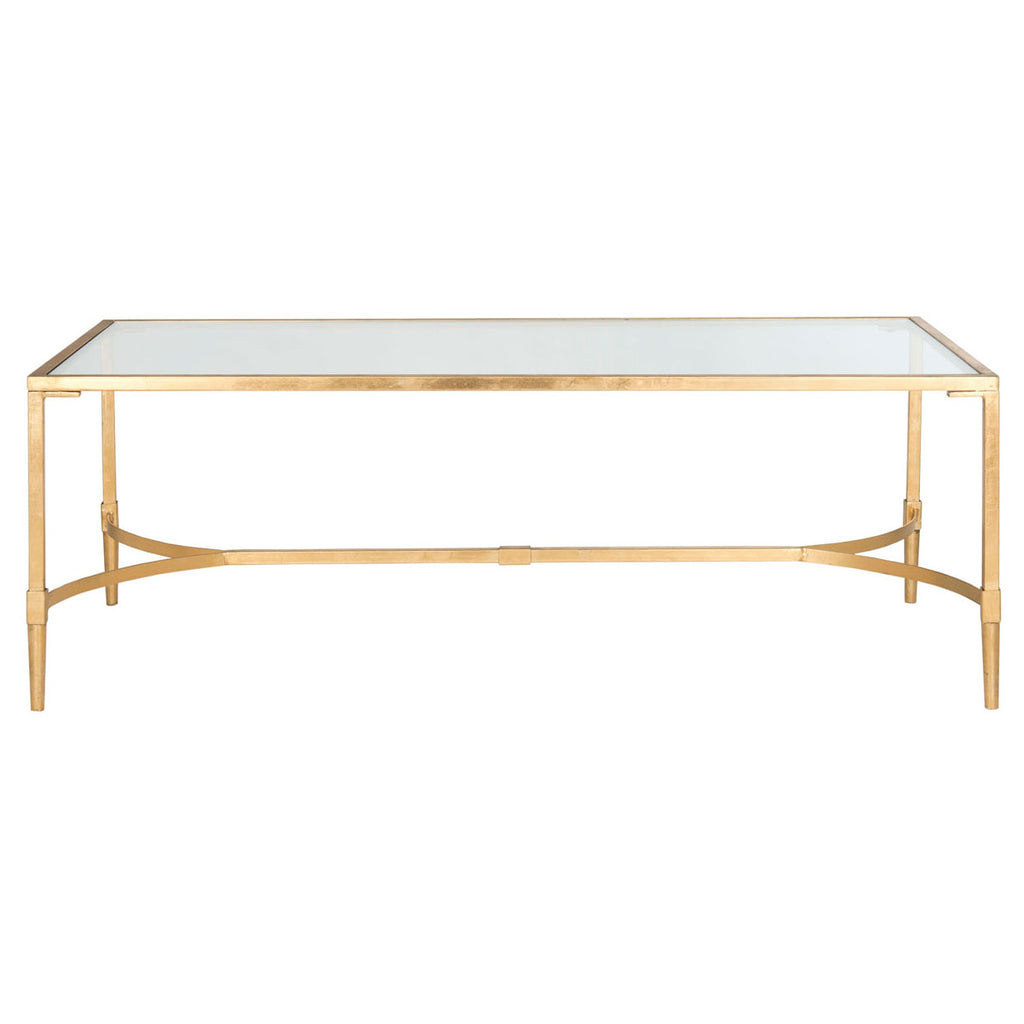 The epitome of sleek sophistication, this coffee table brings a designer look to the living room or entry hall. A wonderful example of metal artistry, this table is crafted of solid iron with gold and lacquer finish, and a tempered glass top.