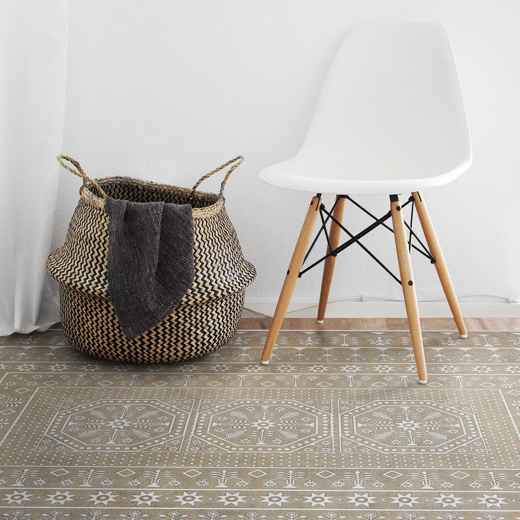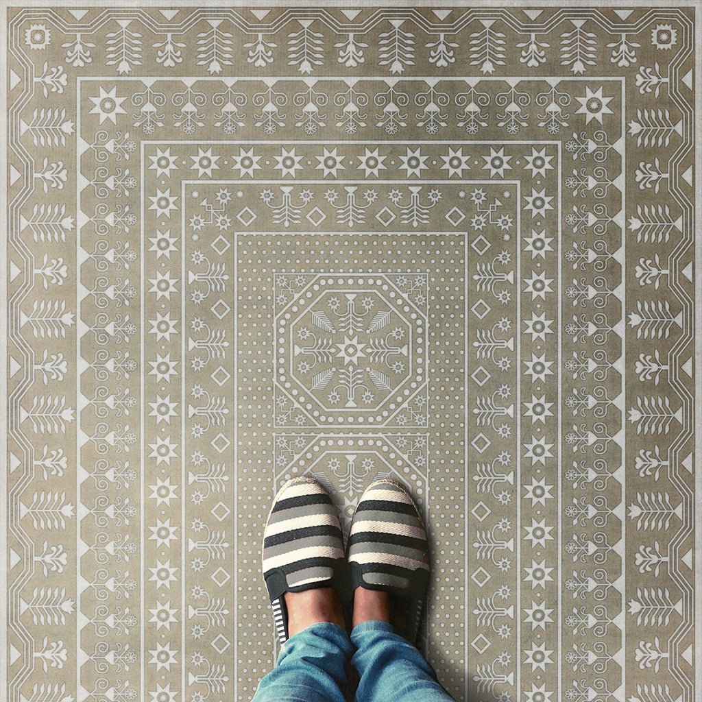 The Time Long Past vinyl floor cloth from the Folk Art Museum Embroidery collection was inspired by vintage linoleum. Perfect for kitchens, baths, screened in porches and patios, the durable vinyl floorcloths are easy to clean and always lay flat. Vinyl floorcloths are made with two-ply vinyl with latex padded backing, designed to be fade-resistant in direct sunlight and durable against the elements but work best in controlled outdoor environments.