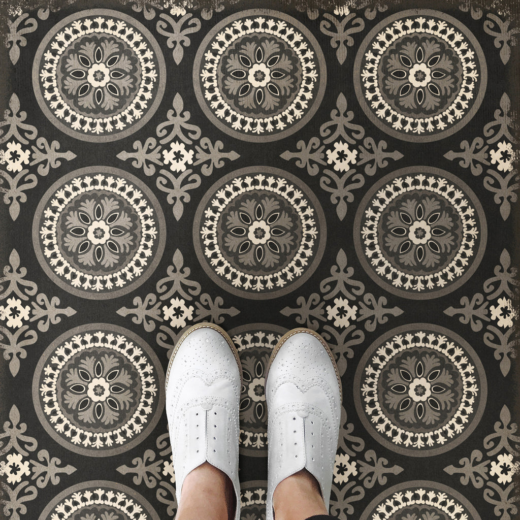 The Karma vinyl floor cloth from the Pattern 43 collection was inspired by vintage linoleum. Perfect for kitchens, baths, screened in porches and patios, the durable vinyl floorcloths are easy to clean and always lay flat. Vinyl floorcloths are made with two-ply vinyl with latex padded backing, designed to be fade-resistant in direct sunlight and durable against the elements but work best in controlled outdoor environments.
