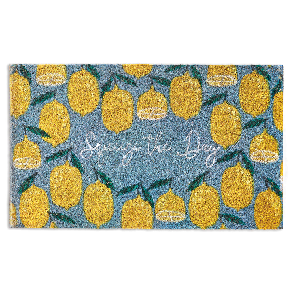 Leaving in the mornings with a bright message to ''Squeeze The Day!'' Each mat is designed with colorfast fibers on a slip resistant rubber backing. This makes it easy to knock debris off your shoes when coming in and preventing a fall when the ground is wet. These mats are easy to clean as you simply shake the dirt out. Fibers will come loose as you begin to use the mat which is perfectly normal.