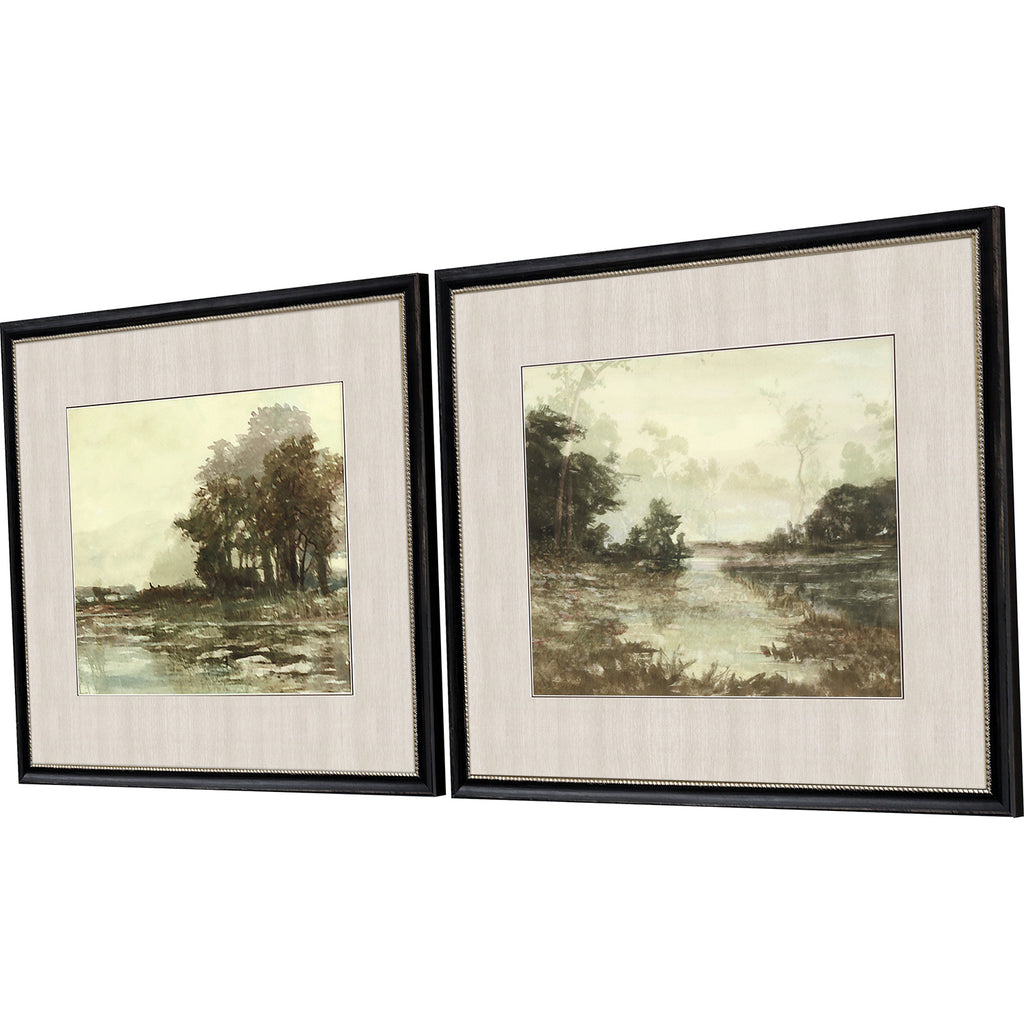 Landscapes in muted shades of green and brown feature premium matting. Framed in an aged black painted wood with washed antique gold beaded lip.
