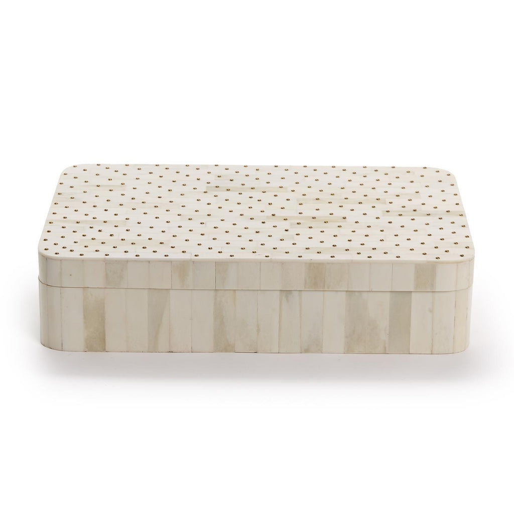 Indulge in luxury with this luxury sized and exquisite 9" x 13" studded covered box from our Treviso collection. Perfect for storing precious keepsakes or adding a touch of glamour to your space, this box is a true statement piece. Handmade with impeccable attention to detail, each stud is carefully placed for a seamless finish. Ideal for adding a touch of opulence to your vanity or coffee table.