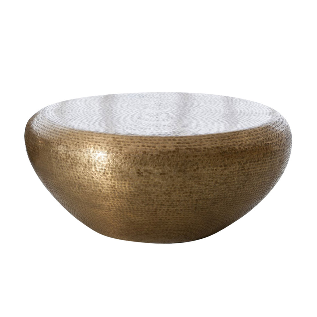 The Studio A Goa cocktail table features hand hammering that brings out rich detail of the solid brass sheet. The soft-curved rim is elegant and sophisticated. Available in two sizes in Antiqued Nickel or Antiqued Brass.