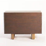 Slats of solid wood are indiviually hand laid to create a modern and luxurious presence. Fluid undulations serve as handles for 6 pull out drawers that open to roomy storage space. Sturdy metal legs provide a lift for a modern feel.