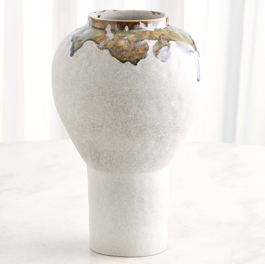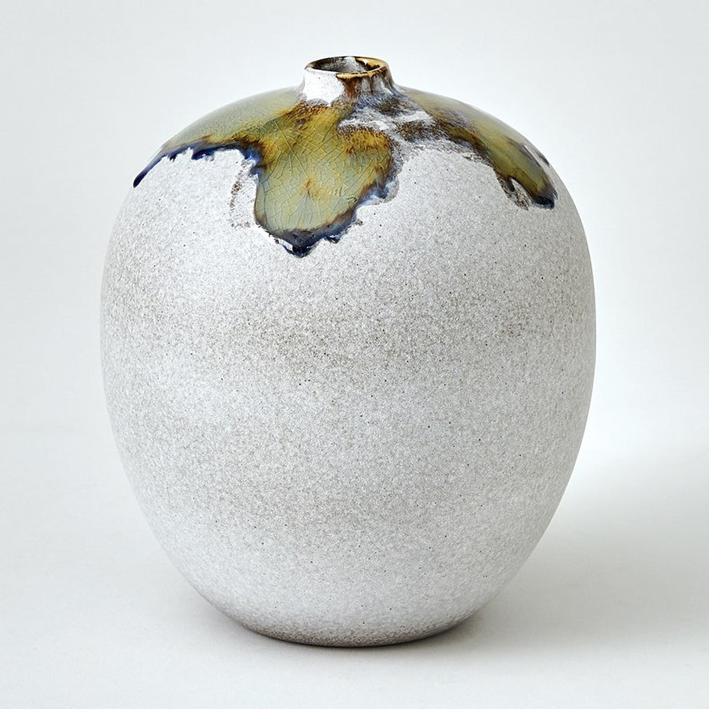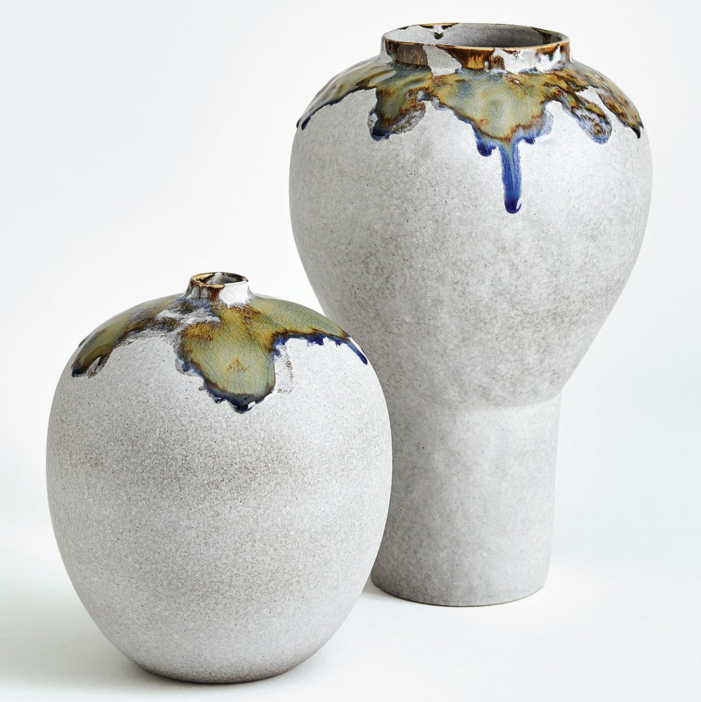 The Volcan Vases and Jars showcase Portuguese slip-molded ceramic with a grey reactive glaze, accented by hand-applied green and blue crackle reactive glazes. Natural variations in the finish make each piece one-of-a-kind, reflecting the beauty of artisanal craftsmanship.