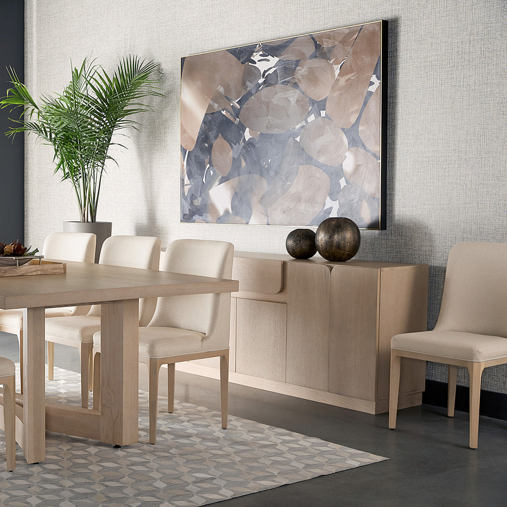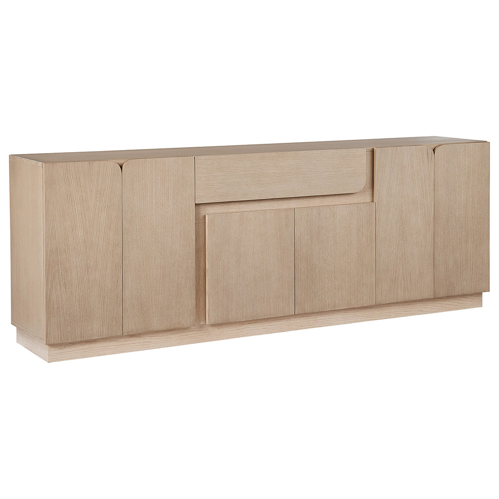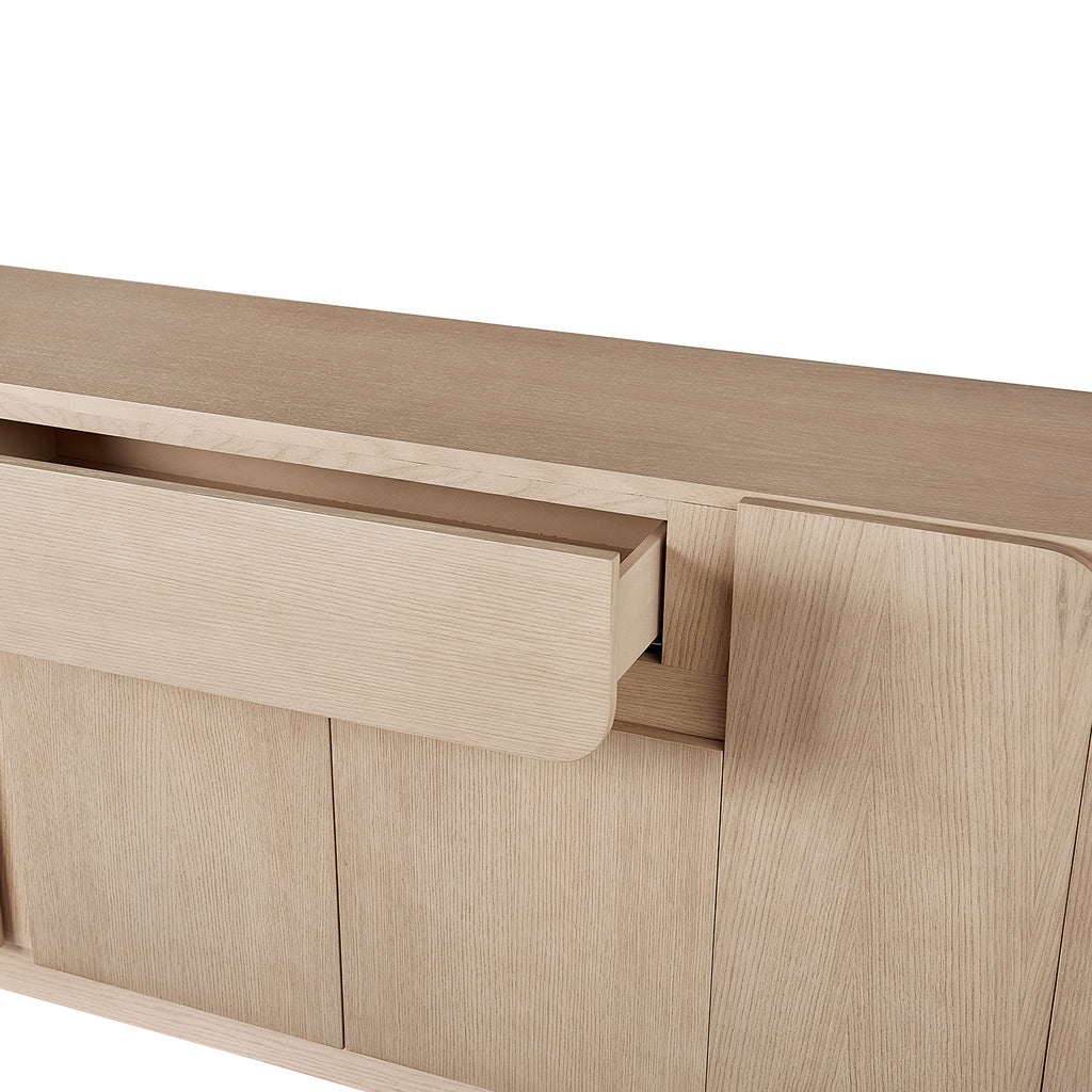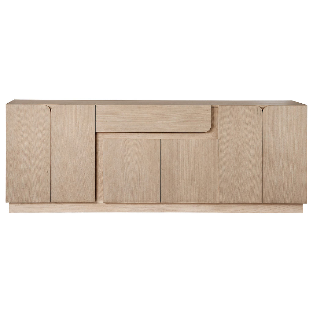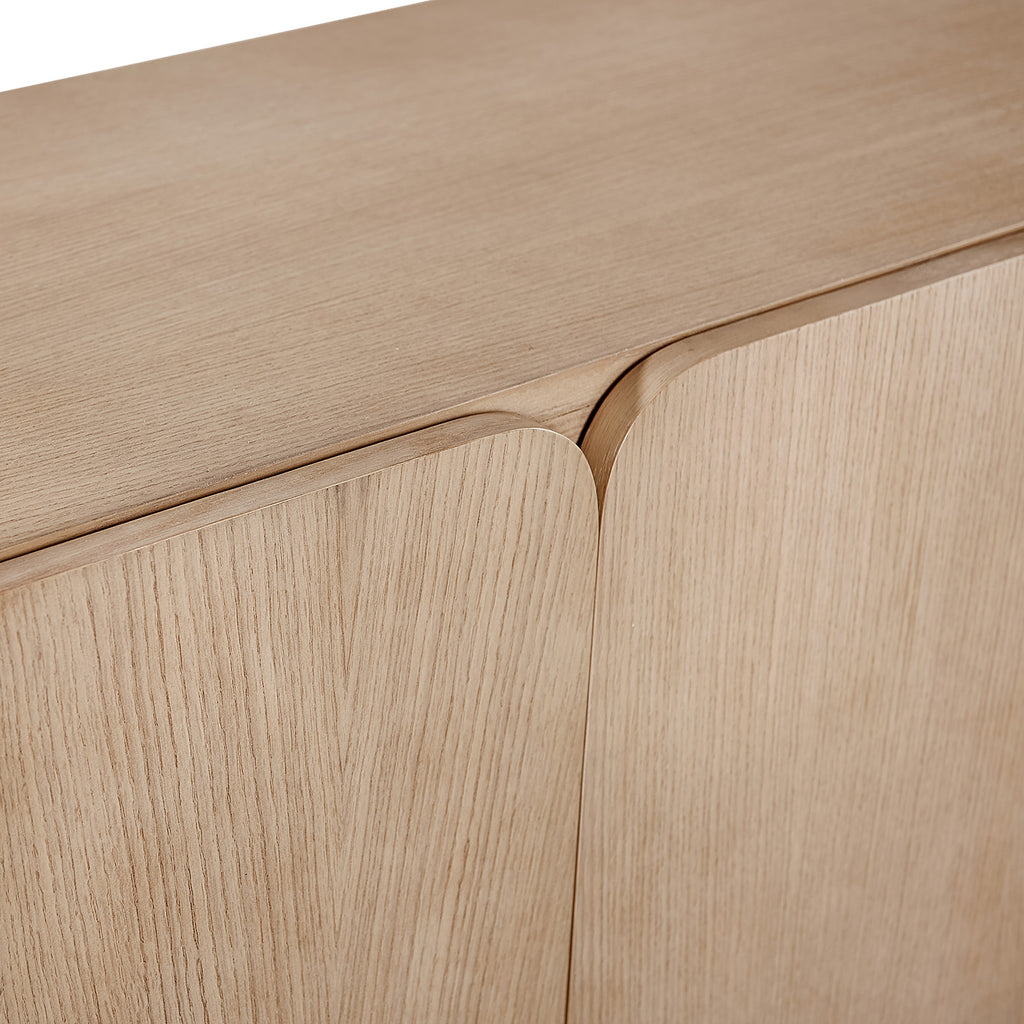 A refreshing take on Scandinavian design, this sideboard is a great addition to any dining or living space. Features a coveted light wash oak wood frame with visible graining and complementing straight and curved edge cabinet fronts.