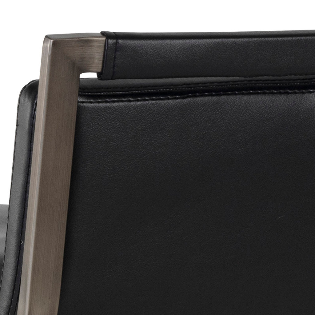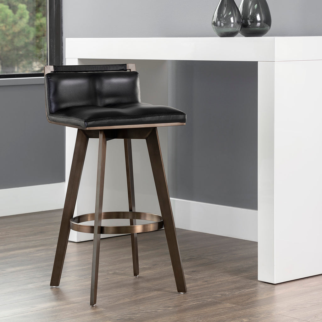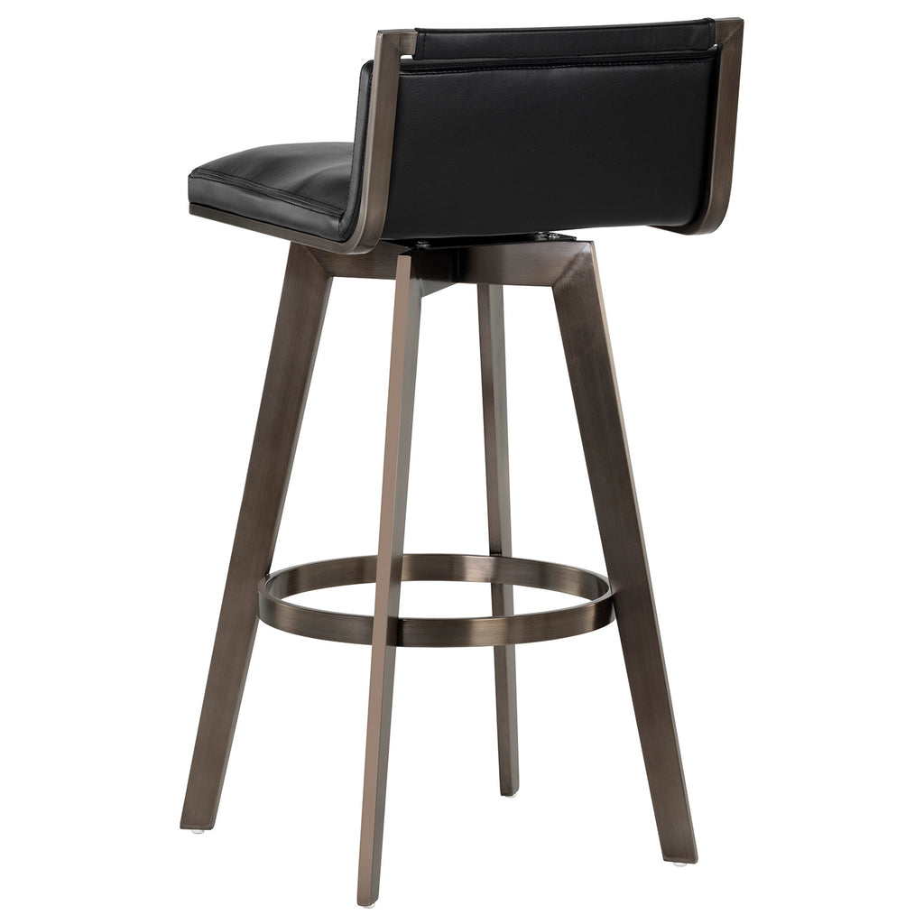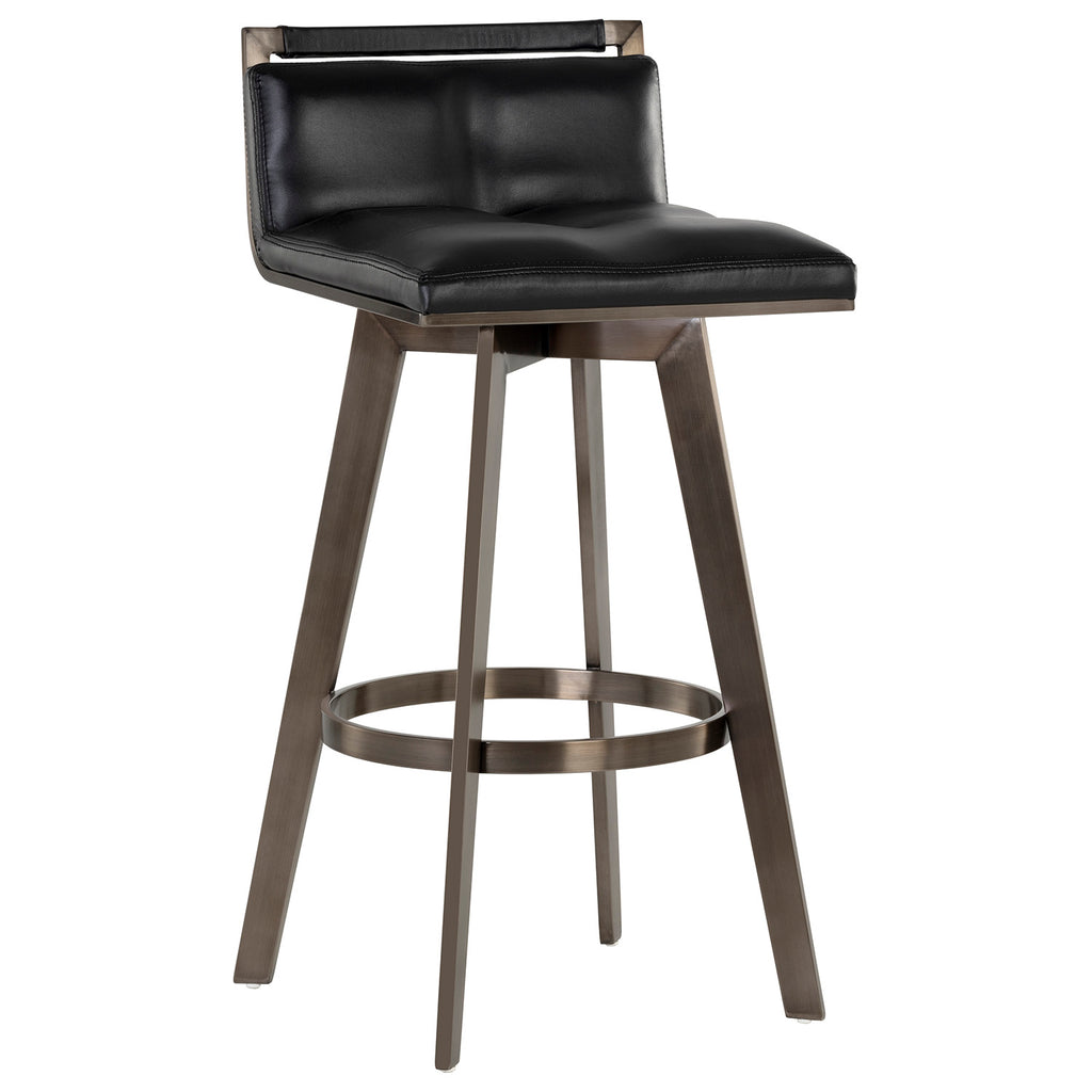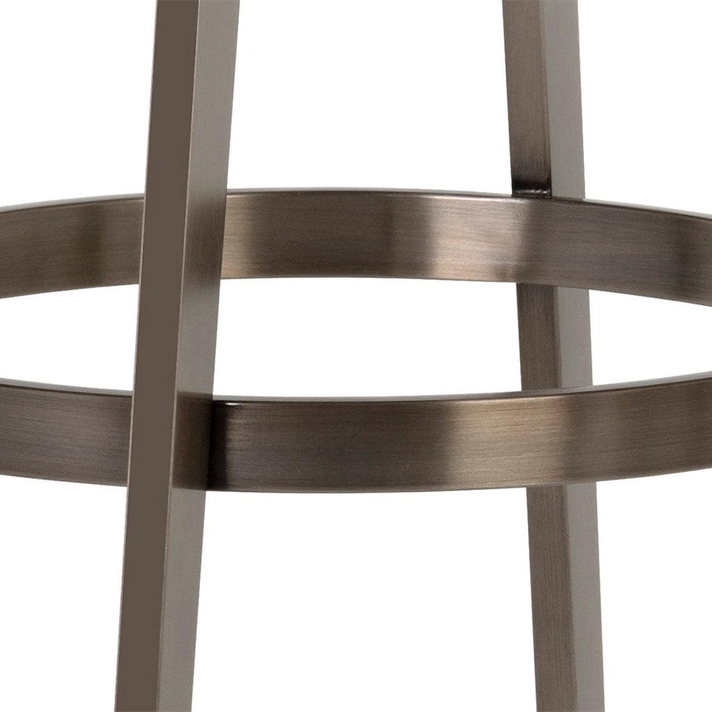 A stylish Art Deco inspired swivel barstool with a low profile seatback. Features a partially exposed frame and legs made of stainless steel with an antique brass finish. Swivel features 360 degree swivel. Suitable for various dining, kitchen and bar spaces of all sizes.