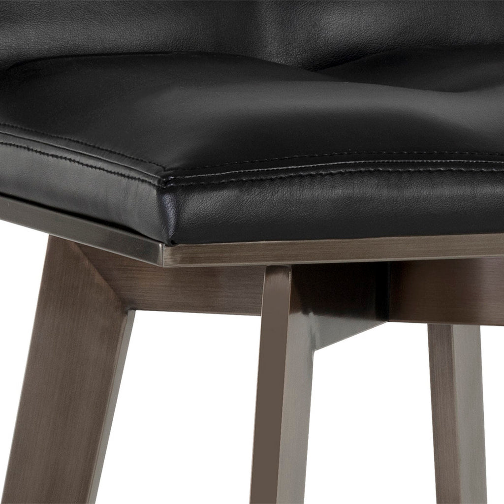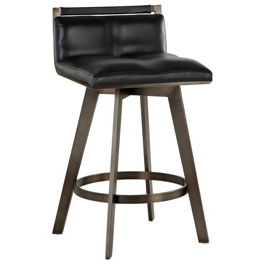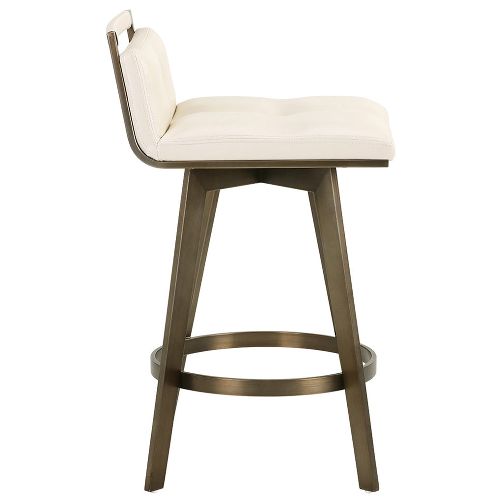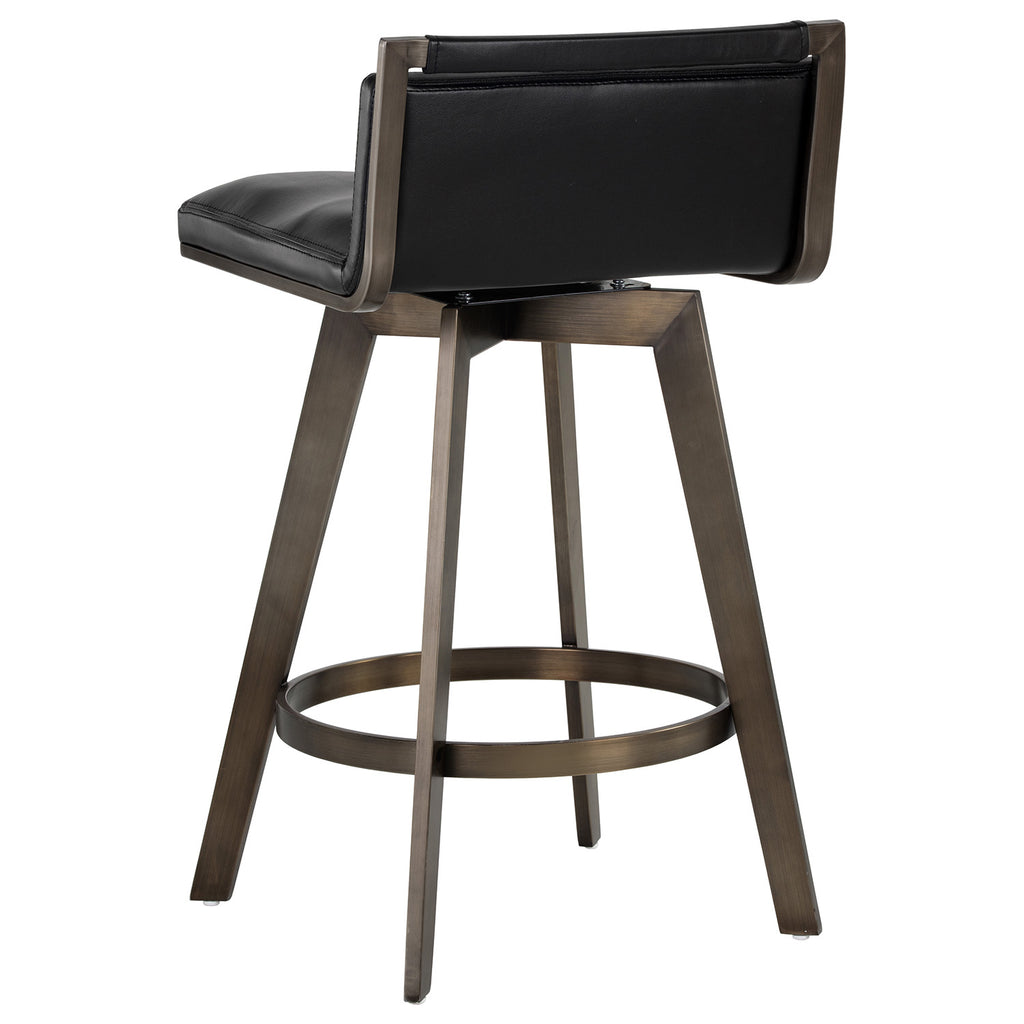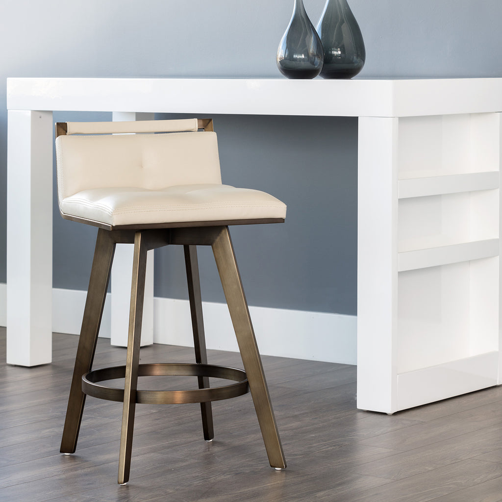 A stylish Art Deco inspired swivel counter stool with a low profile seatback. Features a partially exposed frame and legs made of stainless steel with an antique brass finish. Swivel features 360 degree swivel with 180 degree return. Suitable for residential and commercial environments.