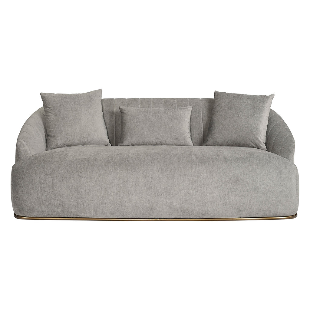 The beautiful lines of this sofa will make a bold and comfortable statement in any space. Features a curved seatback with channel tufting in velvet merlot fabric. Finished with an antique brass iron frame. Three cushions included.
