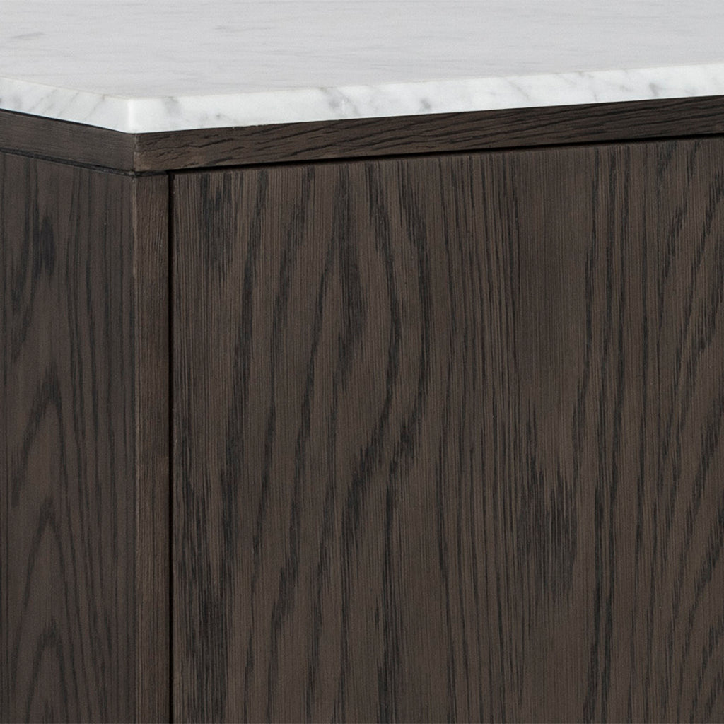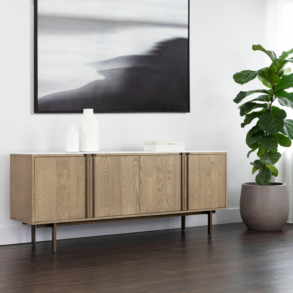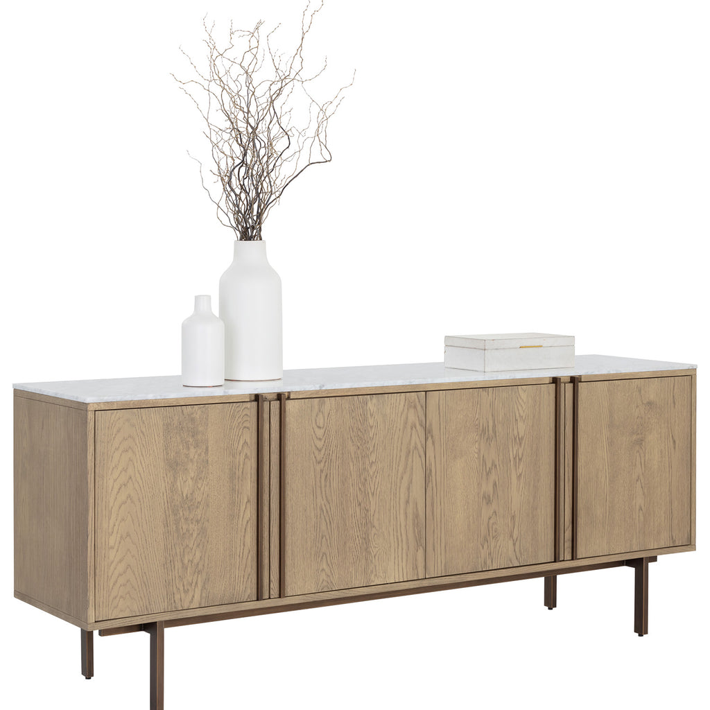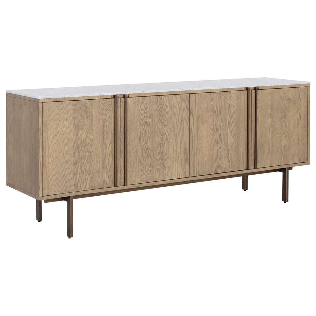 Sleek and handsome, this sideboard fuses the best of mid-century and modern design. Made with a solid oak wood frame and features a beautiful white marble top. Completed with a metal base and hardware in an antique brass finish.