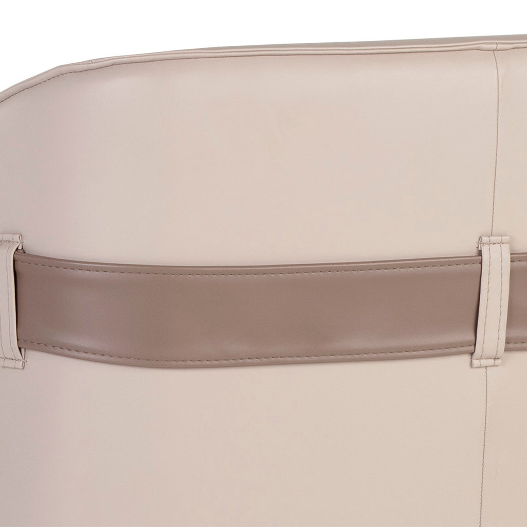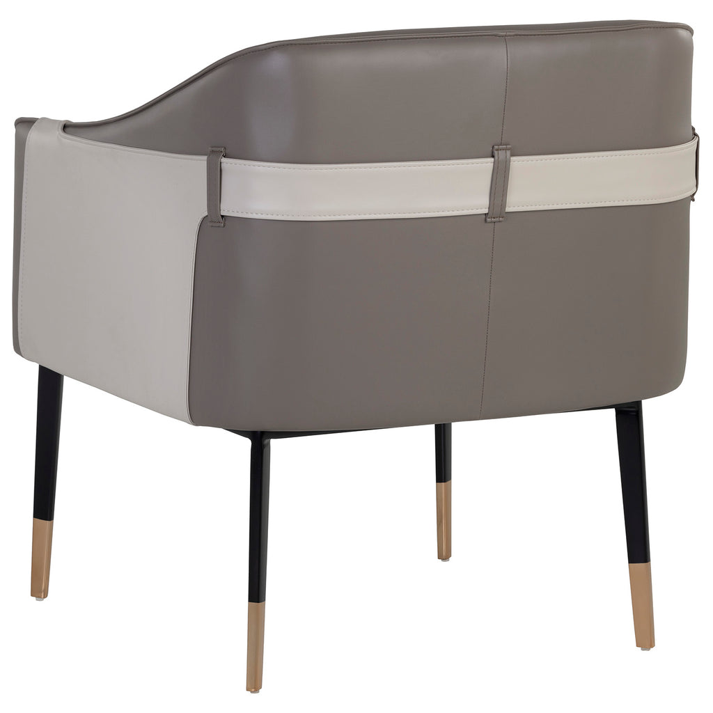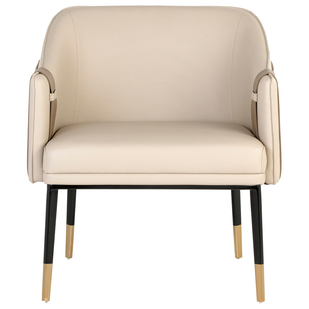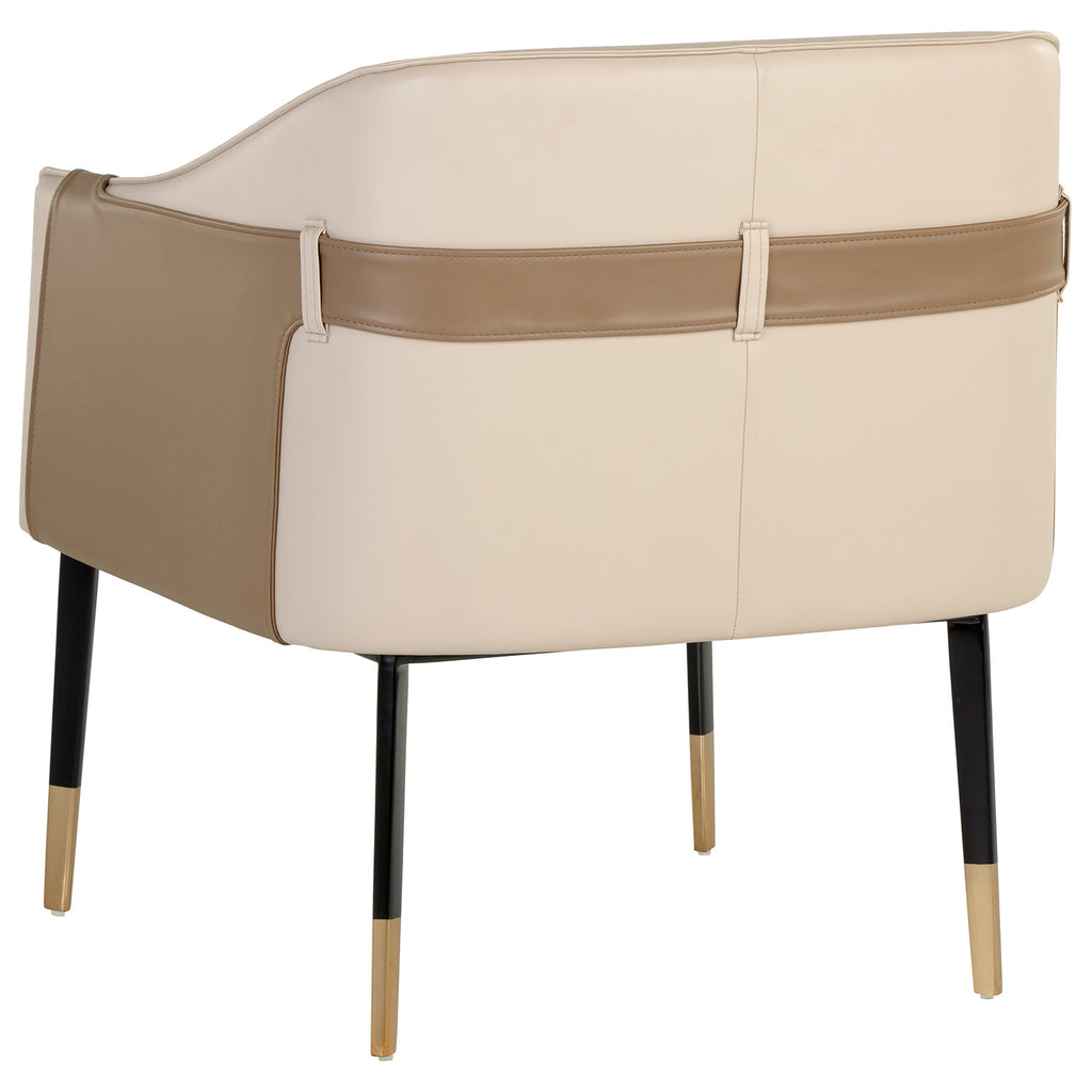 A unique barrel back lounge chair upholstered in supple napa beige faux leather and accented with a contrasting exterior in napa faux leather. Finished with black steel legs and copper foot caps. Suitable for residential and commercial spaces.