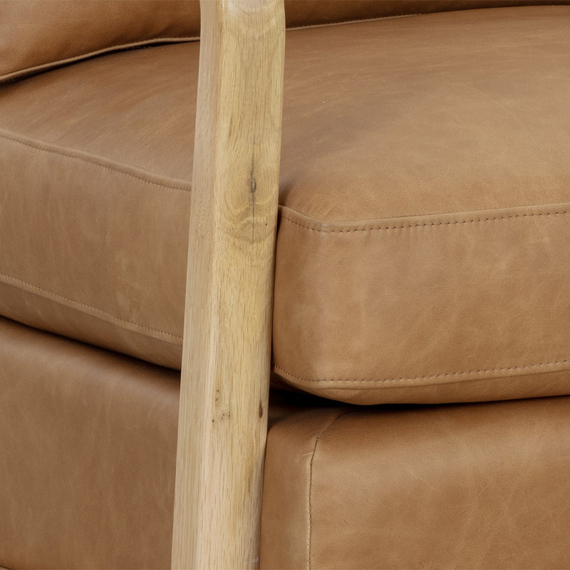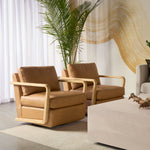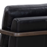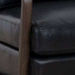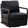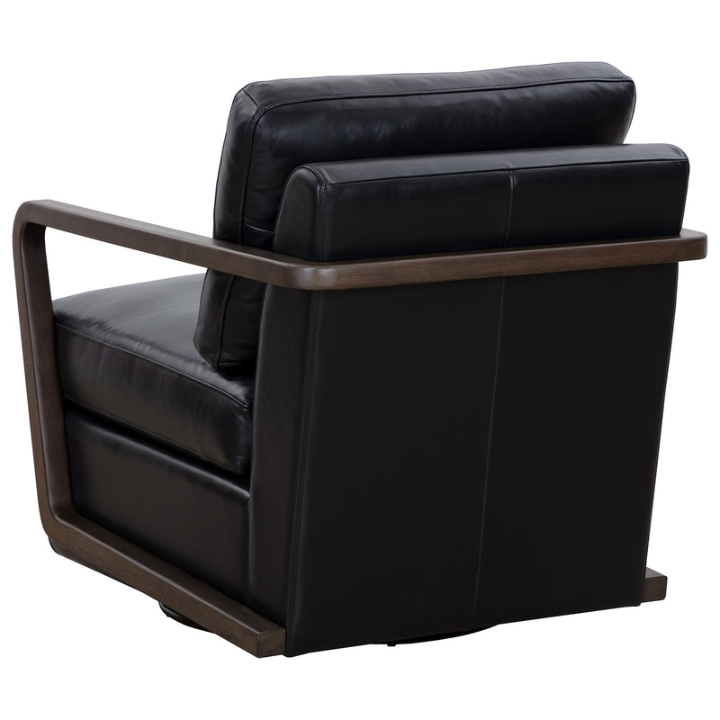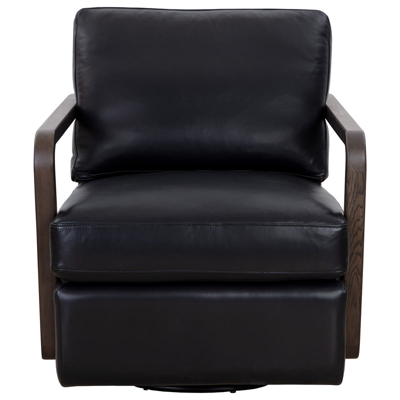 Clean lines make the distinct profile of the Castell Swivel Lounge Chair. Fully upholstered in our cortina black leather for maximum comfort. Brown oak wood arms complete the look.