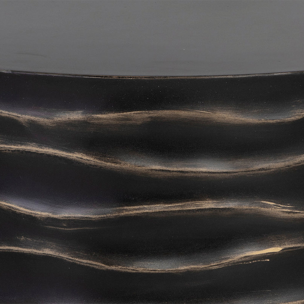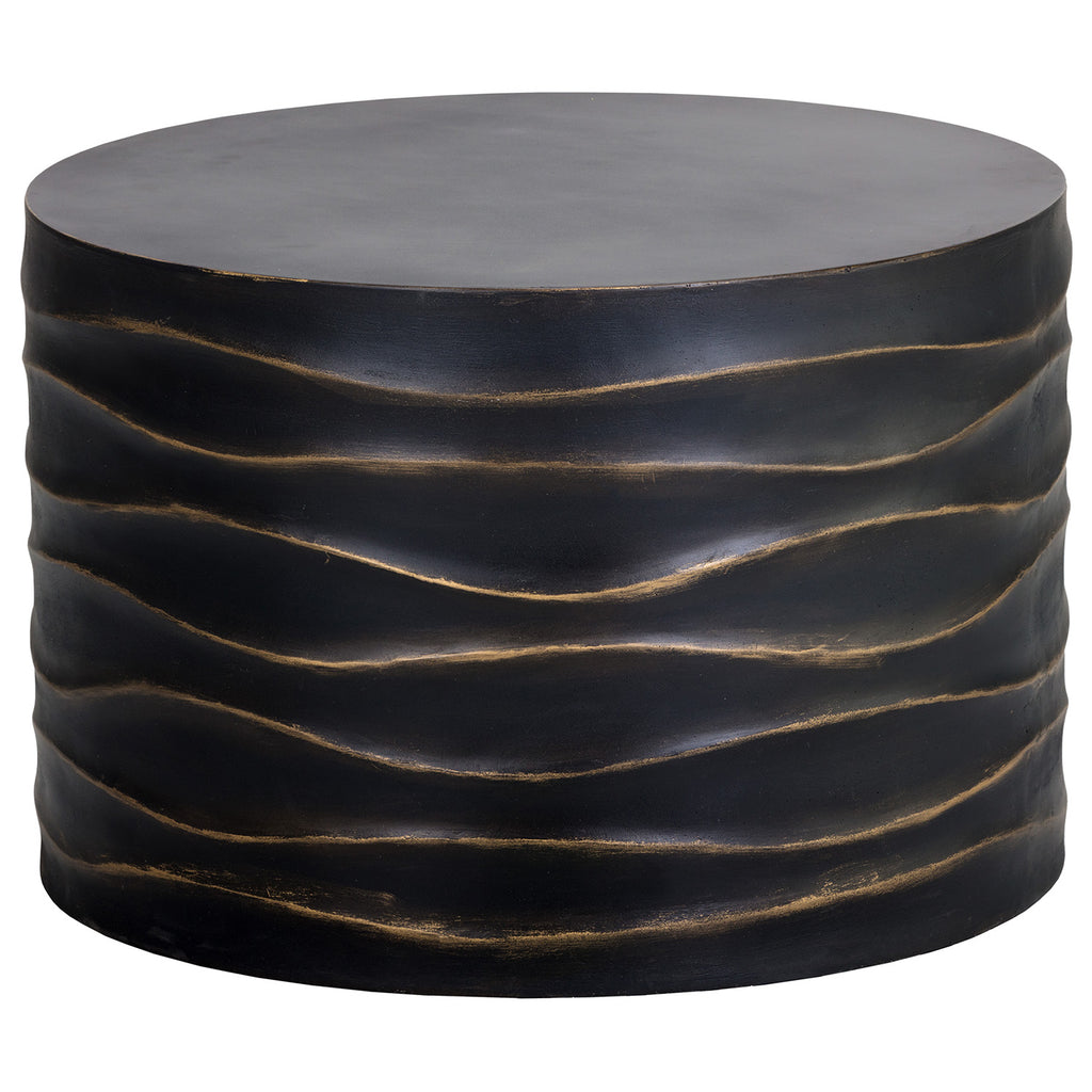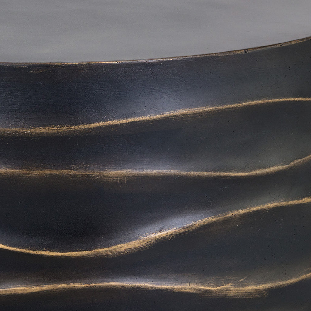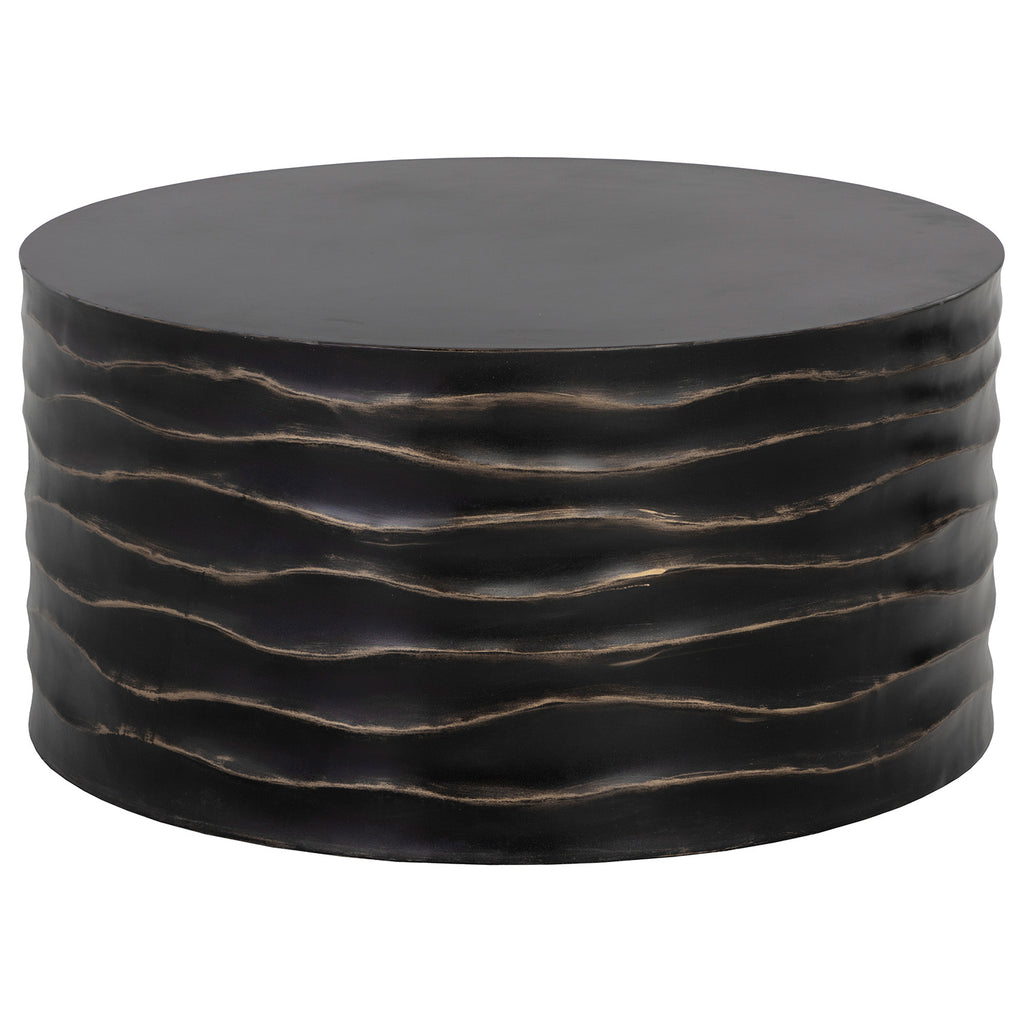 This round coffee table will create a moody environment. This piece features hand sculpted ridges with a painted brass and gold finish. The perfect addition to living, lounge and office spaces.