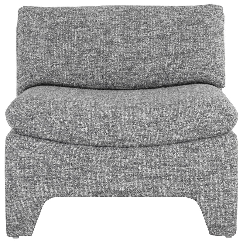 Designed to strike intrigue, this contemporary lounge chair features an eye-catching shape that will command attention. Stocked in boho oatmeal and sesame fabrics, and completed with fully upholstered legs.