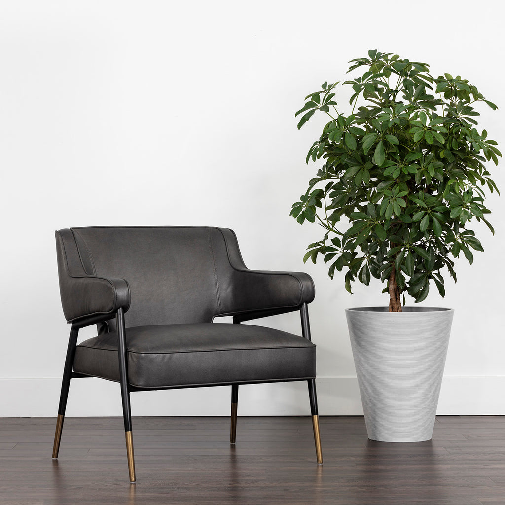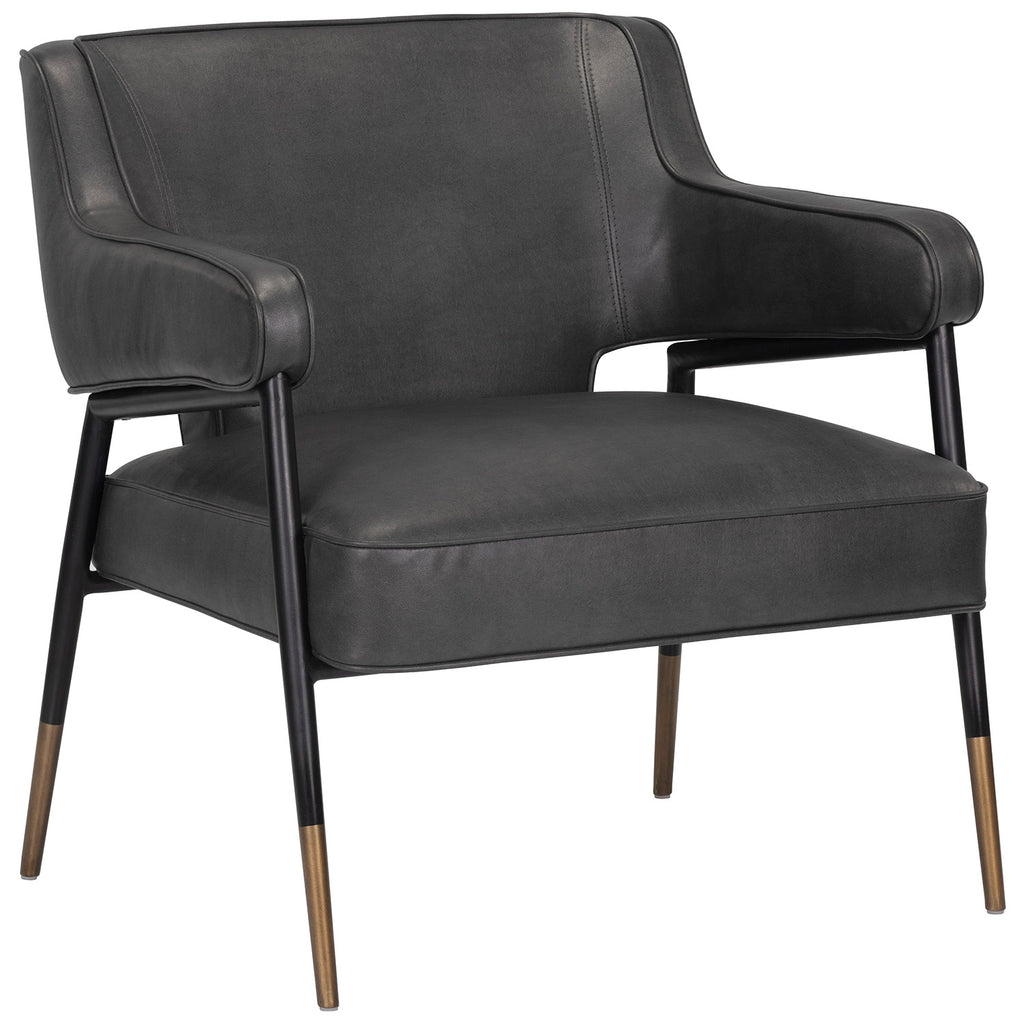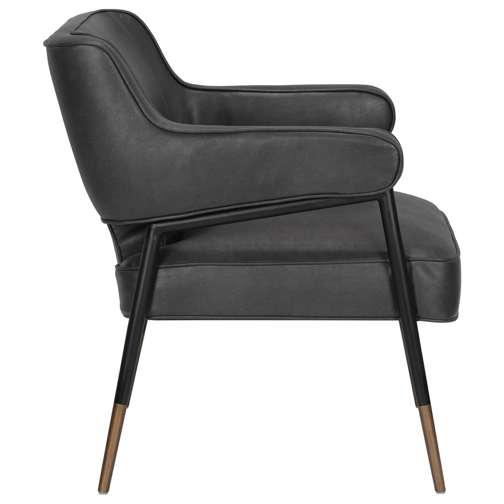A mid-century inspired lounge chair that sits comfortably. Features a sculpted silhouette upholstered in bravo portabella faux leather. Piping, black steel legs, and gold foot caps complete the look.