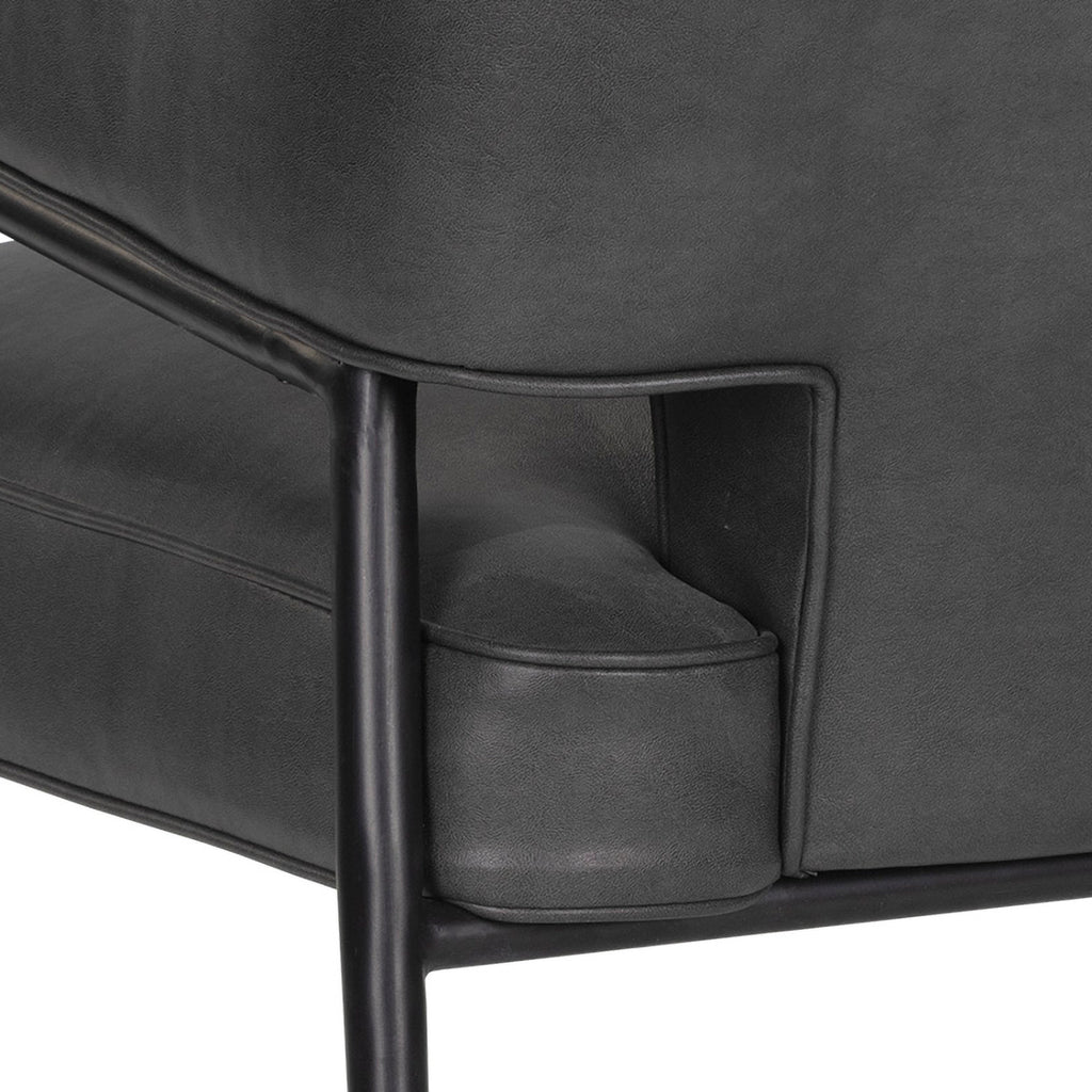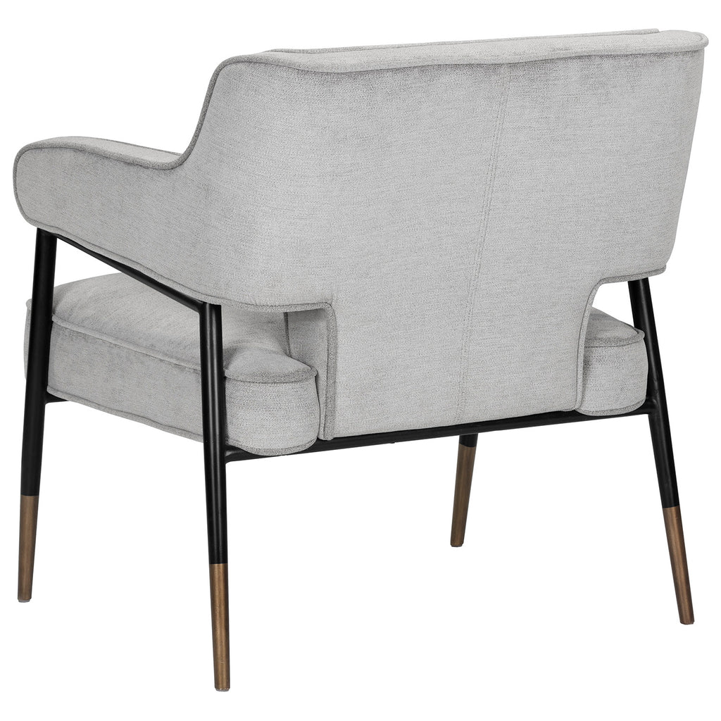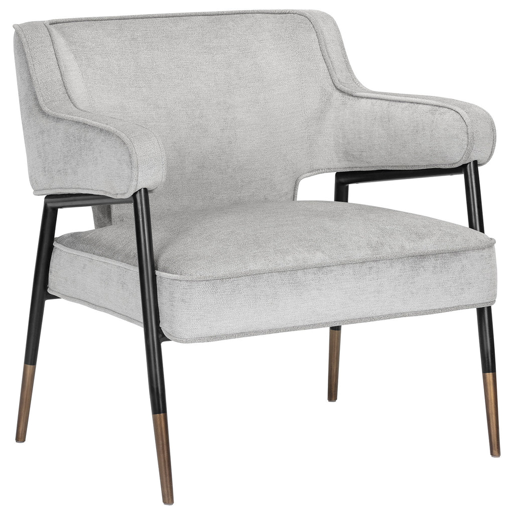 A mid-century inspired lounge chair that sits comfortably. Features a sculpted silhouette upholstered in bravo portabella faux leather. Piping, black steel legs, and gold foot caps complete the look.