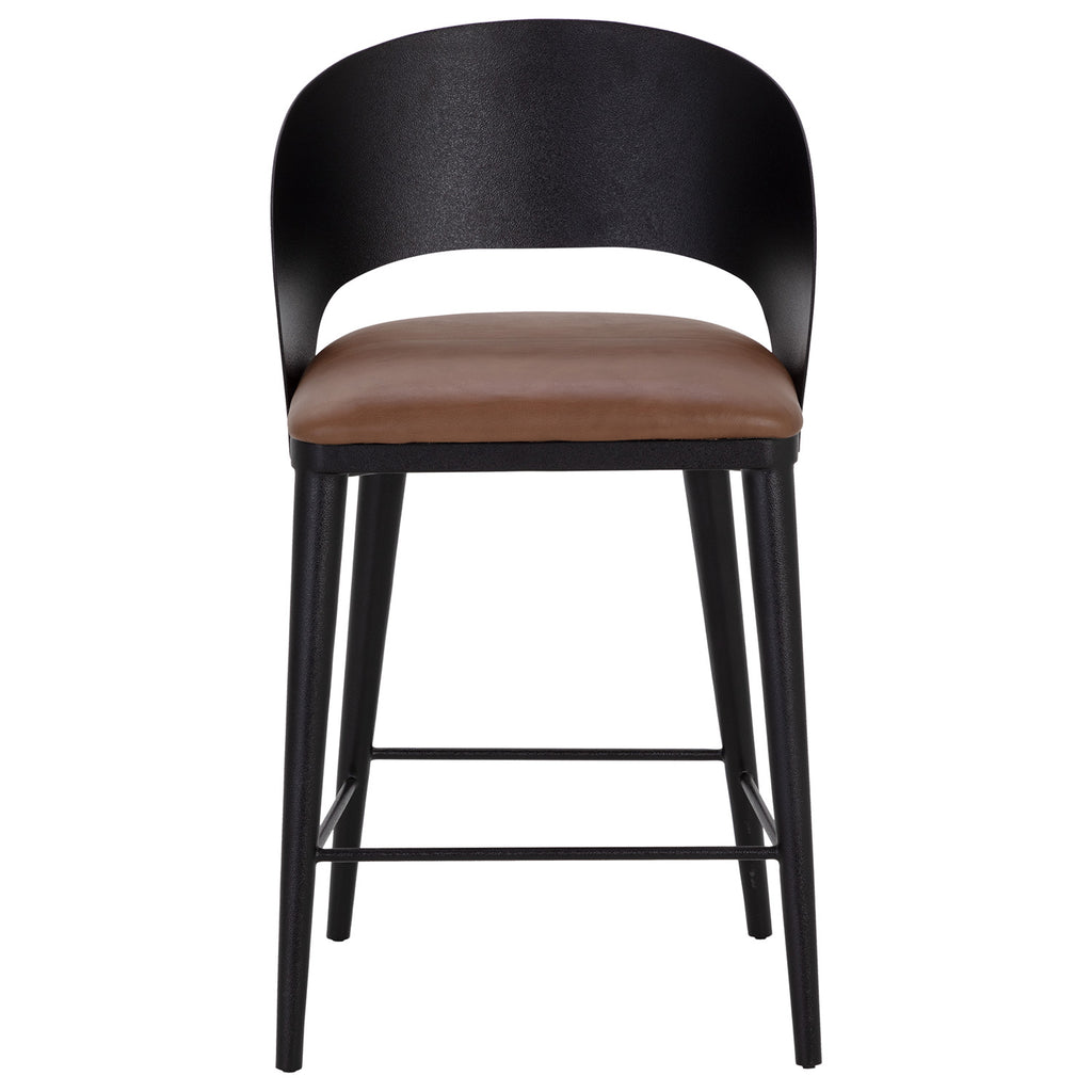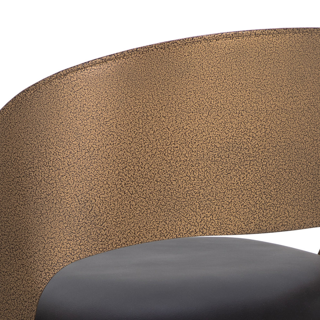 The Dezirae Counter Stool features a sleek profile with a strong curved back for a stylish design that will fit into any dining space. The legs and headrest are beautifully crafted from antique brass textured powder-coated iron. A charcoal leather seat adds an alluring contrast to round out the look.