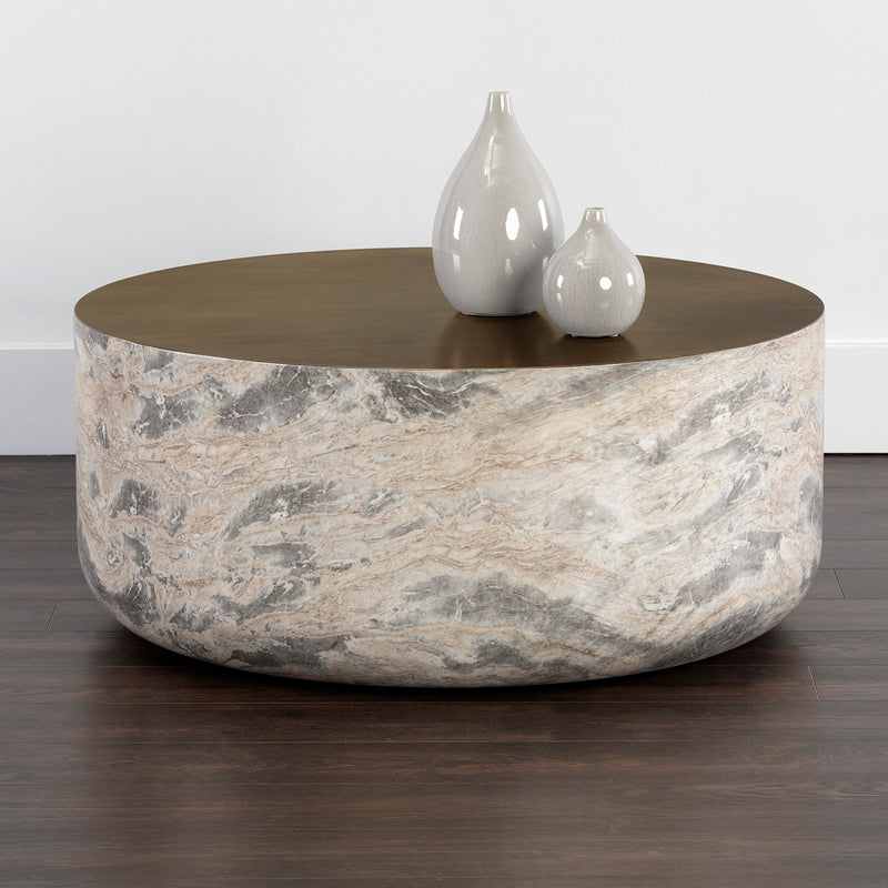 This bold, drum style coffee table will bring form and function into any space.